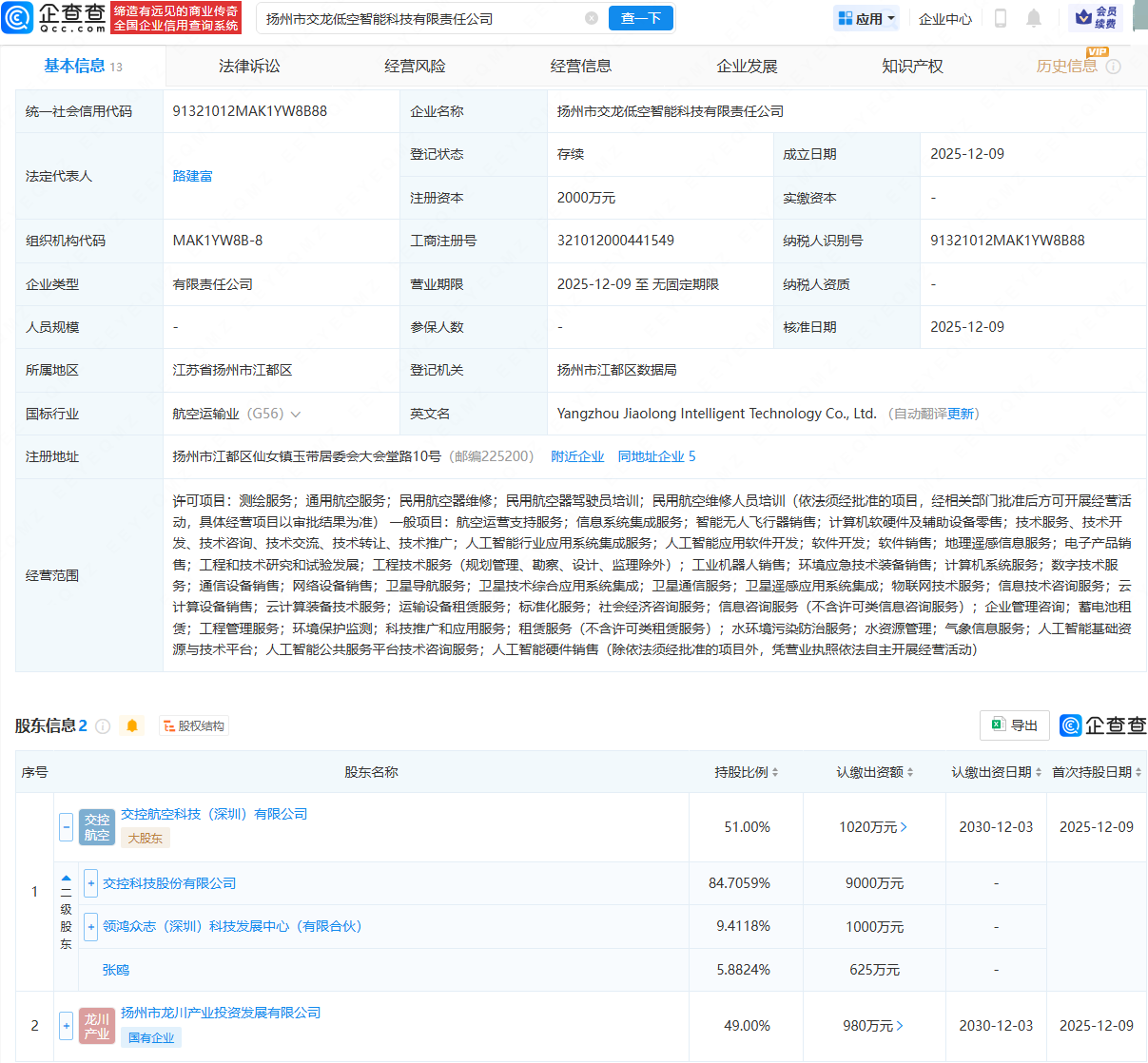 企查查APP显示,近日,扬州市交龙低空智能科技有限责任公司成立,法定代表人为路建富,注册资本为2000万元,经营范围包含:测绘服务;通用航空服务;民用航空器维修;航空运营支持服务;智能无人飞行器销售等。企查查股权穿透显示,该公司由交控科技(688015)旗下交控航空科技(深圳)有限公司、扬州市龙川产业投资发展有限公司共同持股。