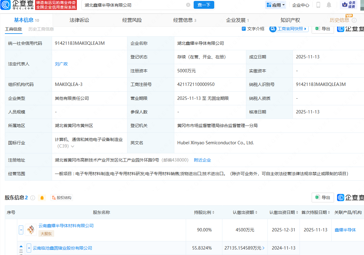 企查查APP显示,近日,湖北鑫耀半导体有限公司成立,法定代表人为刘广政,注册资本为5000万元,经营范围包含:电子专用材料制造;电子专用材料研发;电子专用材料销售;货物进出口;技术进出口。企查查股权穿透显示,该公司由云南锗业(002428)旗下云南鑫耀半导体材料有限公司等共同持股。