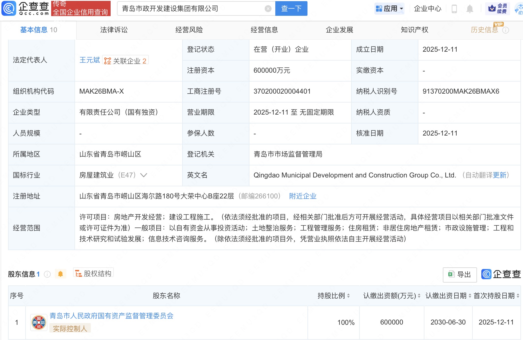 企查查APP显示,近日,青岛市政开发建设集团有限公司成立,法定代表人为王元斌,注册资本60亿人民币,经营范围含房地产开发经营、建设工程施工、以自有资金从事投资活动、土地整治服务等。企查查股权穿透显示,该公司由青岛市人民政府国有资产监督管理委员会全资持股。
