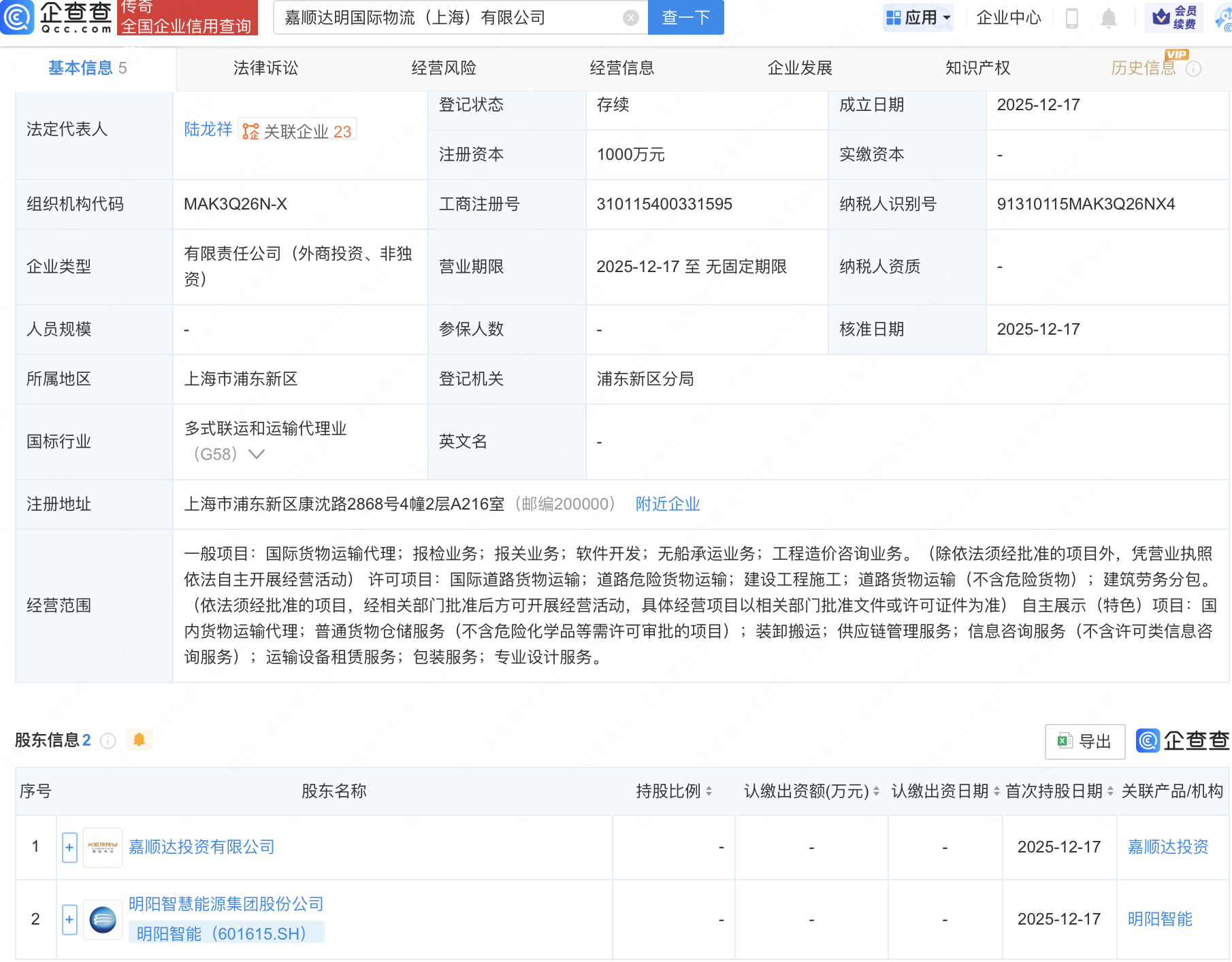 企查查APP显示,近日,嘉顺达明国际物流(上海)有限公司成立,注册资本1000万元,经营范围包含:国际货物运输代理;报检业务;报关业务;软件开发;无船承运业务等。企查查股权穿透显示,该公司由明阳智能(601615)等共同持股。
