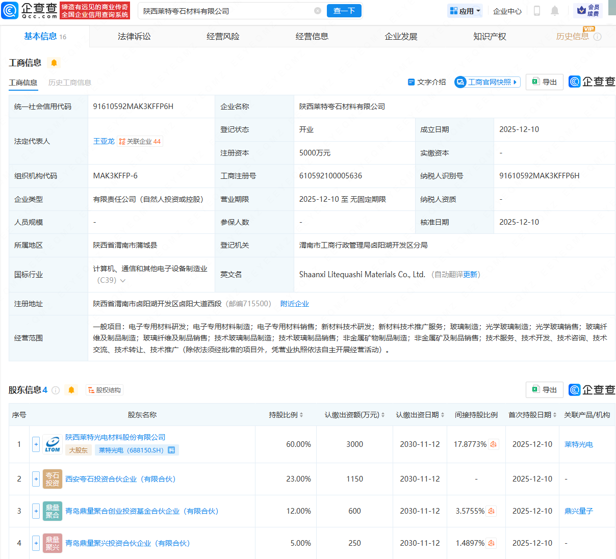 企查查APP显示,近日,陕西莱特夸石材料有限公司成立,法定代表人为王亚龙,注册资本为5000万元,经营范围包含:电子专用材料研发;电子专用材料销售;新材料技术研发;玻璃制造;光学玻璃制造等。企查查股权穿透显示,该公司由莱特光电(688150)、西安夸石投资合伙企业(有限合伙)等共同持股。