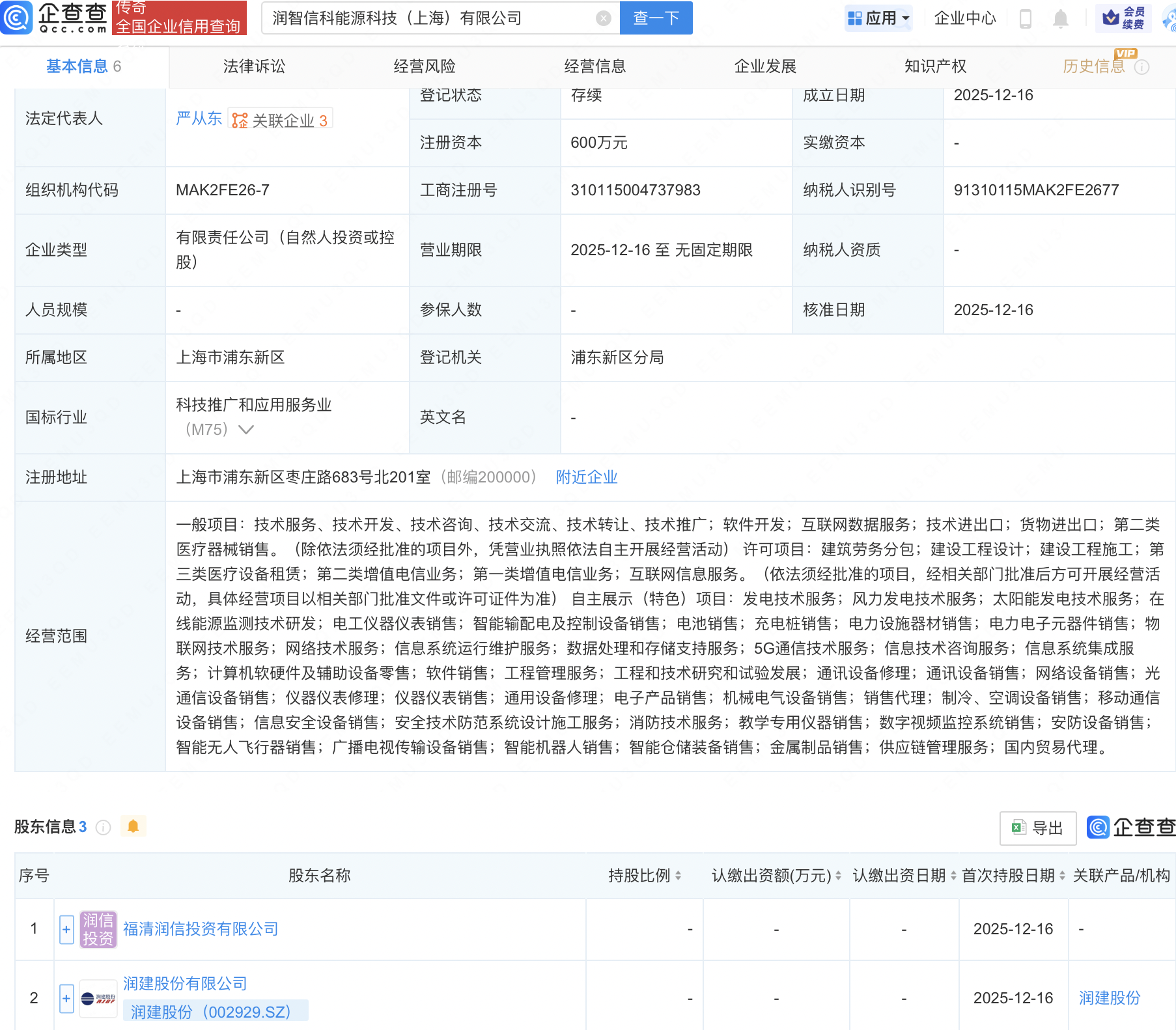 企查查APP显示,近日,润智信科能源科技(上海)有限公司成立,经营范围包含:智能无人飞行器销售;广播电视传输设备销售;智能机器人销售等。企查查股权穿透显示,该公司由润建股份(002929)等共同持股。
