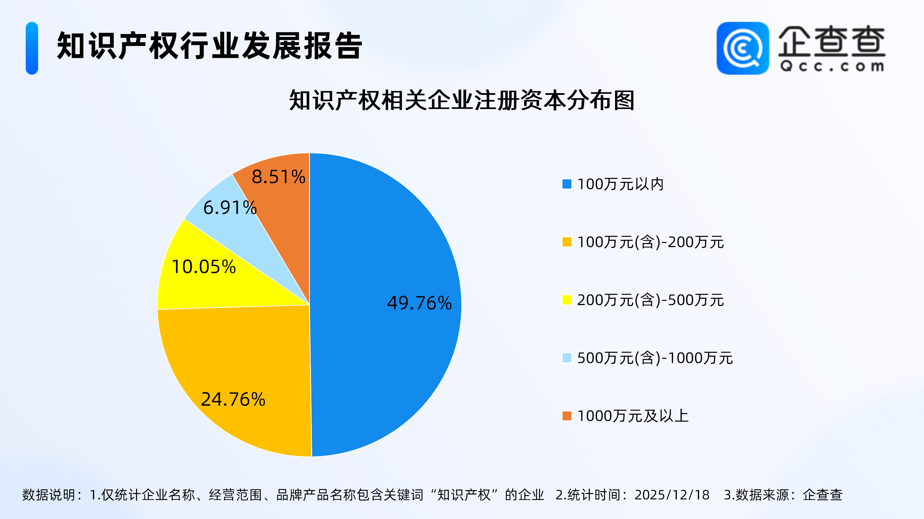 企查查数据显示,从注册资本来看,知识产权相关企业多为轻量级企业,注册资本在100万元以内的相关企业近半,占比49.76%,其次注册资本在100万元(含)-200万元的相关企业占比24.76%。注册资本在1000万元及以上的相关企业占比8.51%。