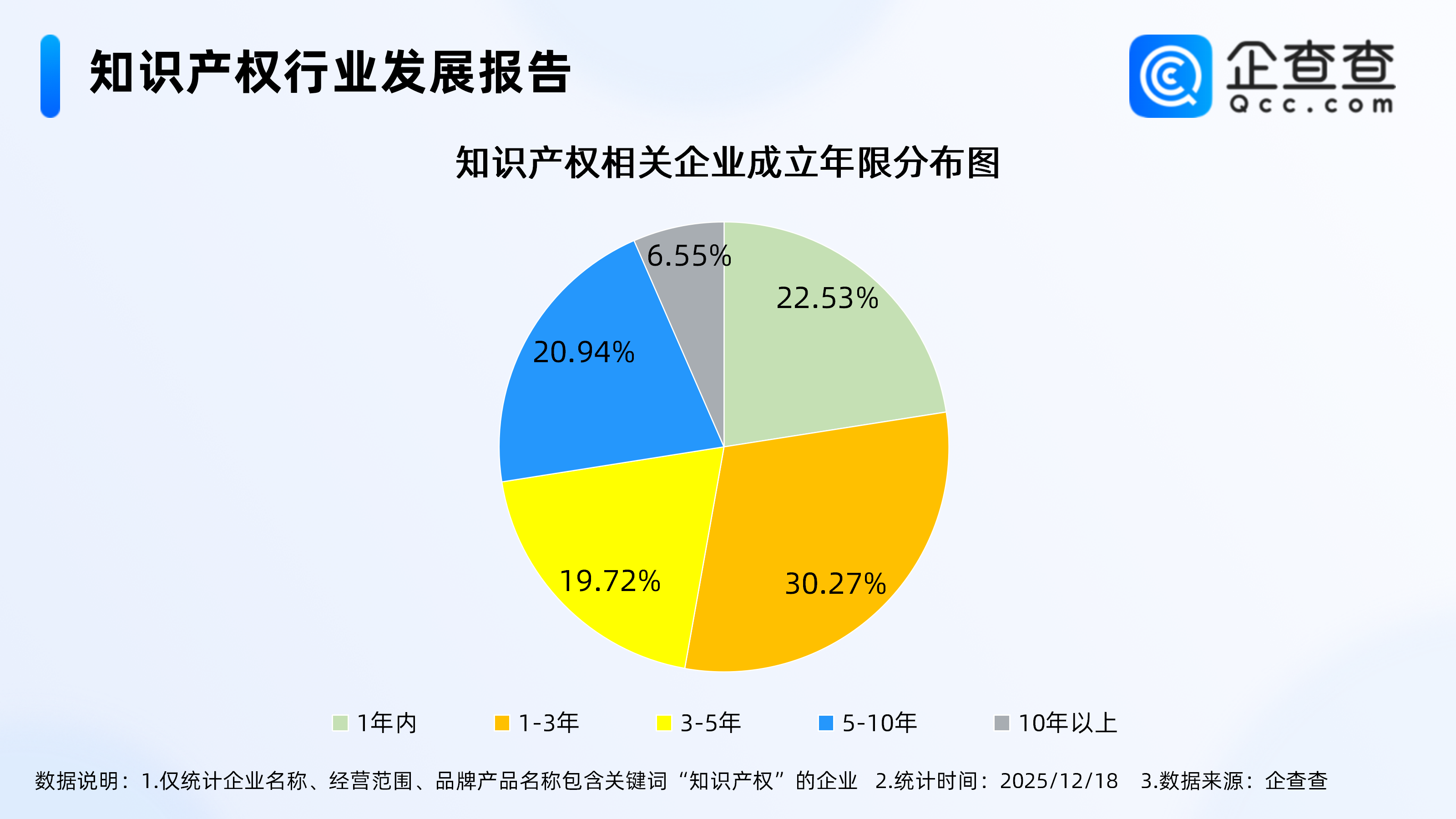 企查查数据显示,截至12月18日,国内现存知识产权相关企业77.58万家。从经营时间来看,知识产权相关企业多成立于近三年,成立年限在1-3年的相关企业最多,占比30.27%,其次在1年内的相关企业占比22.53%。