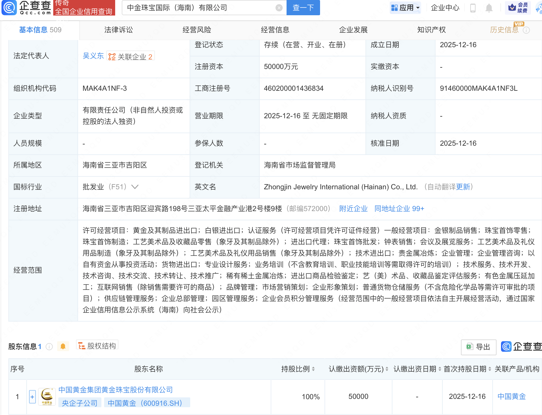 企查查APP显示,近日,中金珠宝国际(海南)有限公司成立,注册资本5亿元,经营范围包含:稀有稀土金属冶炼;进出口商品检验鉴定;艺(美)术品、收藏品鉴定评估服务;有色金属压延加工等。企查查股权穿透显示,该公司由中国黄金(600916)全资持股。