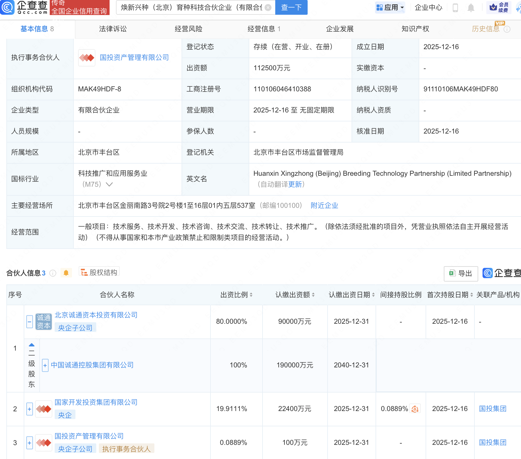 企查查APP显示,近日,焕新兴种(北京)育种科技合伙企业(有限合伙)成立,出资额11.25亿元,经营范围包含:技术服务、技术开发、技术咨询、技术交流、技术转让、技术推广。企查查股权穿透显示,该企业由中国诚通控股集团有限公司全资子公司北京诚通资本投资有限公司、国家开发投资集团有限公司等共同持股。