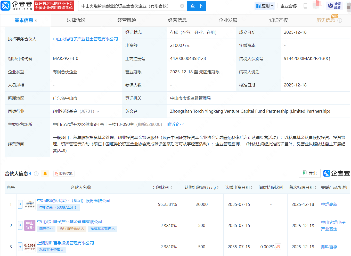 企查查APP显示,近日,中山火炬盈康创业投资基金合伙企业(有限合伙)成立,执行事务合伙人为中山火炬电子产业基金管理有限公司,出资额2.1亿元,经营范围包含私募股权投资基金管理、创业投资基金管理服务等。企查查股权穿透显示,该基金由中炬高新(600872)、中山火炬电子产业基金管理有限公司、上海鼎晖百孚投资管理有限公司共同出资。
