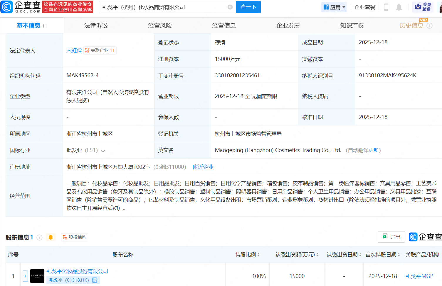 企查查APP显示,近日,毛戈平(杭州)化妆品商贸有限公司成立,法定代表人为宋虹佺,注册资本1.5亿元,经营范围包含化妆品零售、化妆品批发、互联网销售等。企查查股权穿透显示,该公司由毛戈平(01318.HK)全资持股。
