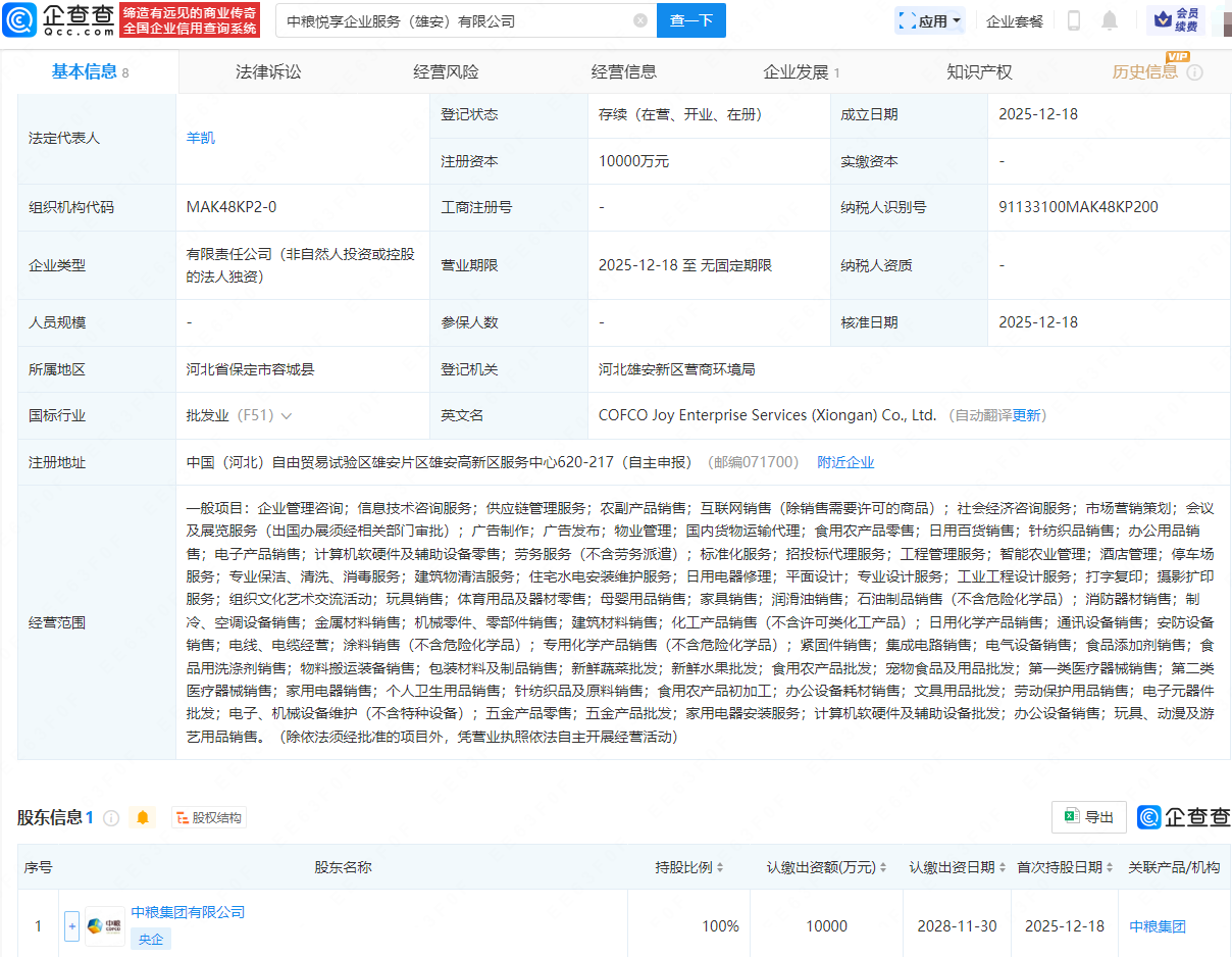 企查查APP显示,近日,中粮悦享企业服务(雄安)有限公司成立,法定代表人为羊凯,注册资本1亿元,经营范围包含企业管理咨询、供应链管理服务、社会经济咨询服务等。企查查股权穿透显示,该公司由中粮集团有限公司全资持股。