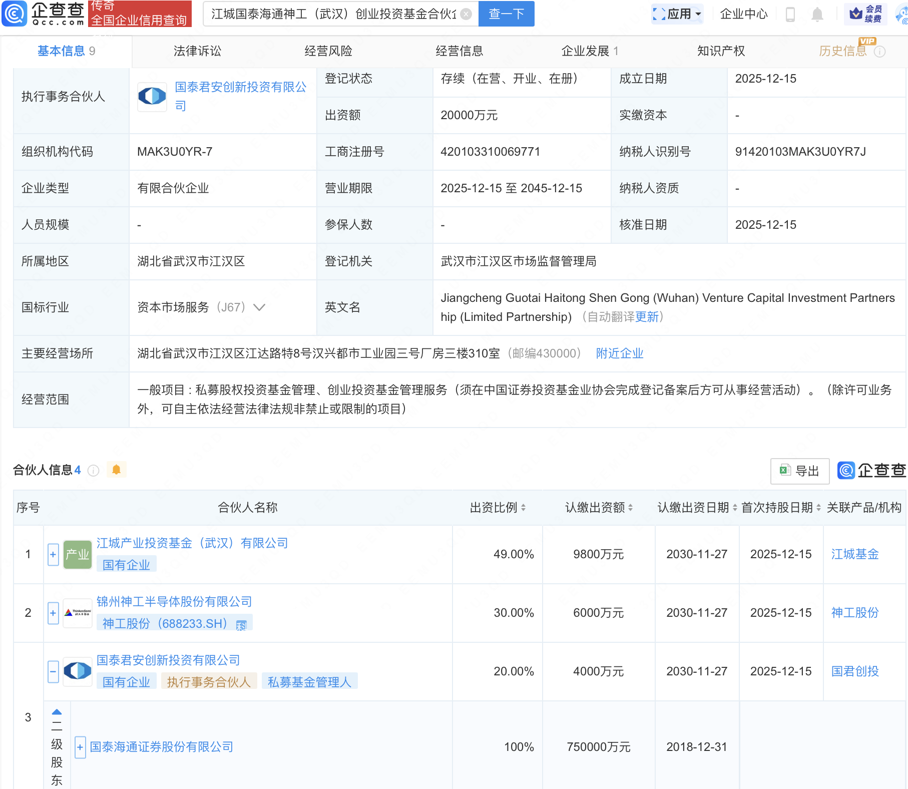 企查查APP显示,近日,江城国泰海通神工(武汉)创业投资基金合伙企业(有限合伙)成立,出资额2亿元,经营范围包含:私募股权投资基金管理、创业投资基金管理服务。企查查股权穿透显示,该企业由神工股份(688233)、国泰海通(601211)全资子公司国泰君安创新投资有限公司等共同出资。