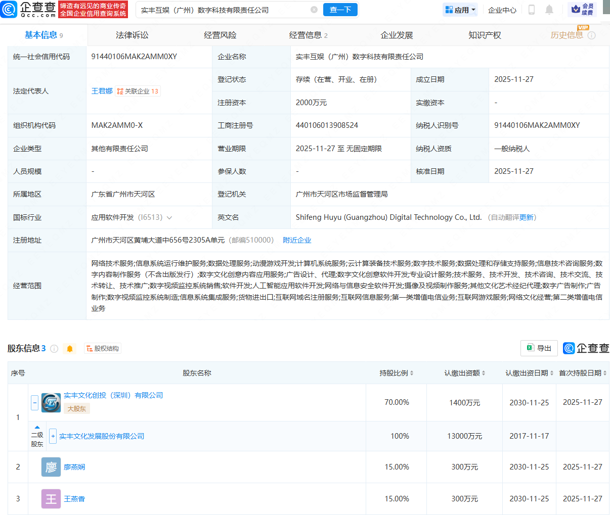 企查查APP显示,近日,实丰互娱(广州)数字科技有限责任公司成立,法定代表人为王君娜,注册资本为2000万元,经营范围包含:网络技术服务;数据处理服务;动漫游戏开发;云计算装备技术服务;人工智能应用软件开发等。企查查股权穿透显示,该公司由实丰文化(002862)全资子公司实丰文化创投(深圳)有限公司等共同持股。