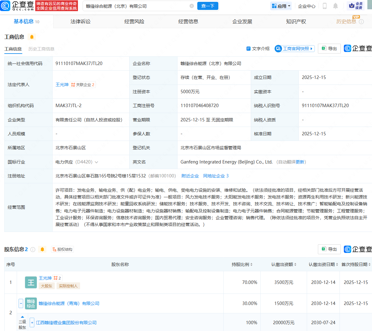企查查APP显示,近日,赣锋综合能源(北京)有限公司成立,法定代表人为王光坤,注册资本为5000万元,经营范围包含:发电业务、输电业务、供(配)电业务;风力发电技术服务;太阳能发电技术服务;储能技术服务等。企查查股权穿透显示,该公司由王光坤、赣锋锂业(002460)全资子公司赣锋综合能源(青海)有限公司共同持股。