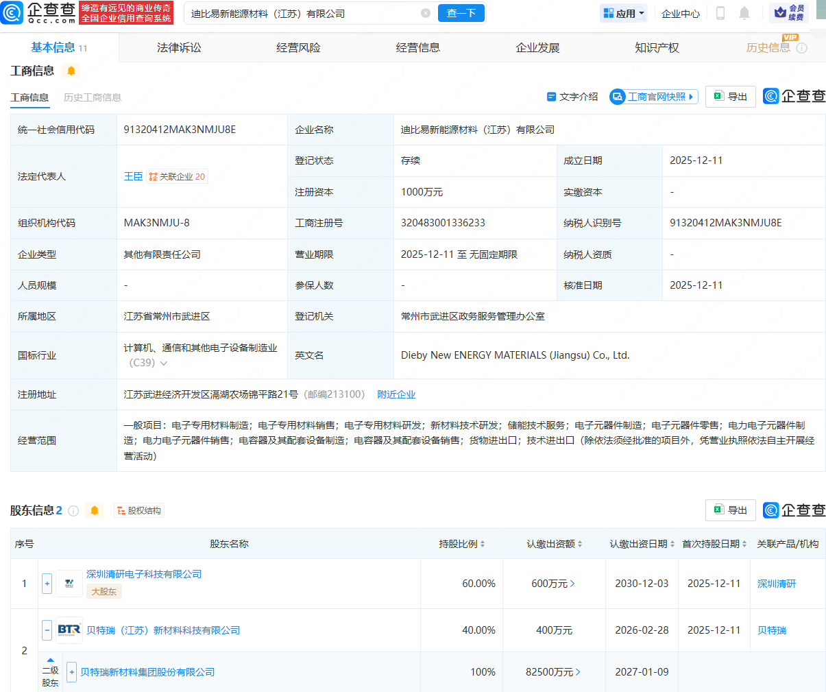 企查查APP显示,近日,迪比易新能源材料(江苏)有限公司成立,法定代表人为王臣,注册资本为1000万元,经营范围包含:电子专用材料制造;电子专用材料研发;新材料技术研发;储能技术服务;电子元器件制造等。企查查股权穿透显示,该公司由深圳清研电子科技有限公司、贝特瑞(920185)全资子公司贝特瑞(江苏)新材料科技有限公司共同持股。