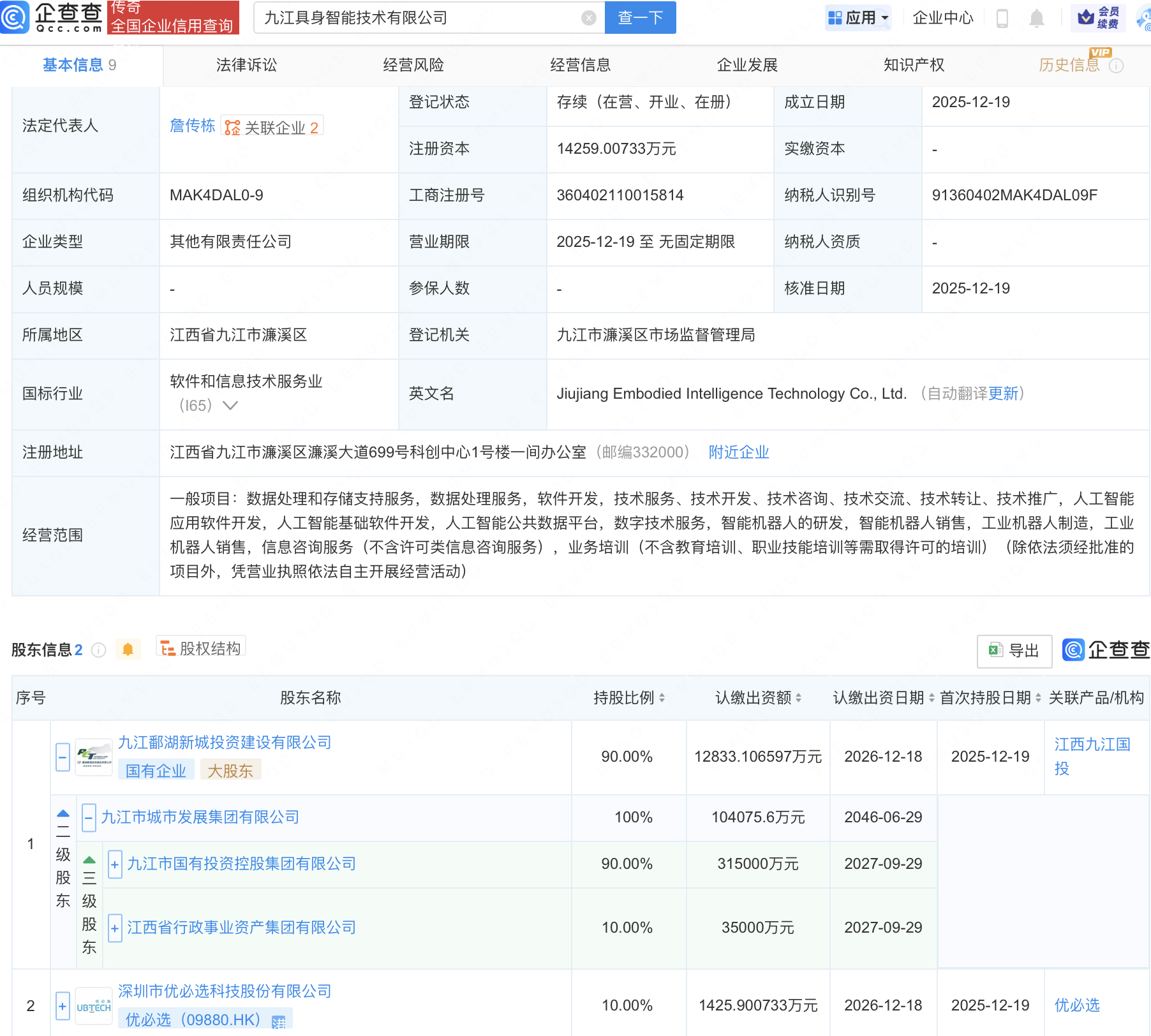 企查查APP显示,近日,九江具身智能技术有限公司成立,注册资本约1.43亿元,经营范围包含:人工智能应用软件开发,人工智能基础软件开发,人工智能公共数据平台,智能机器人的研发,智能机器人销售等。企查查股权穿透显示,该公司由九江鄱湖新城投资建设有限公司、优必选(09880.HK)共同持股。