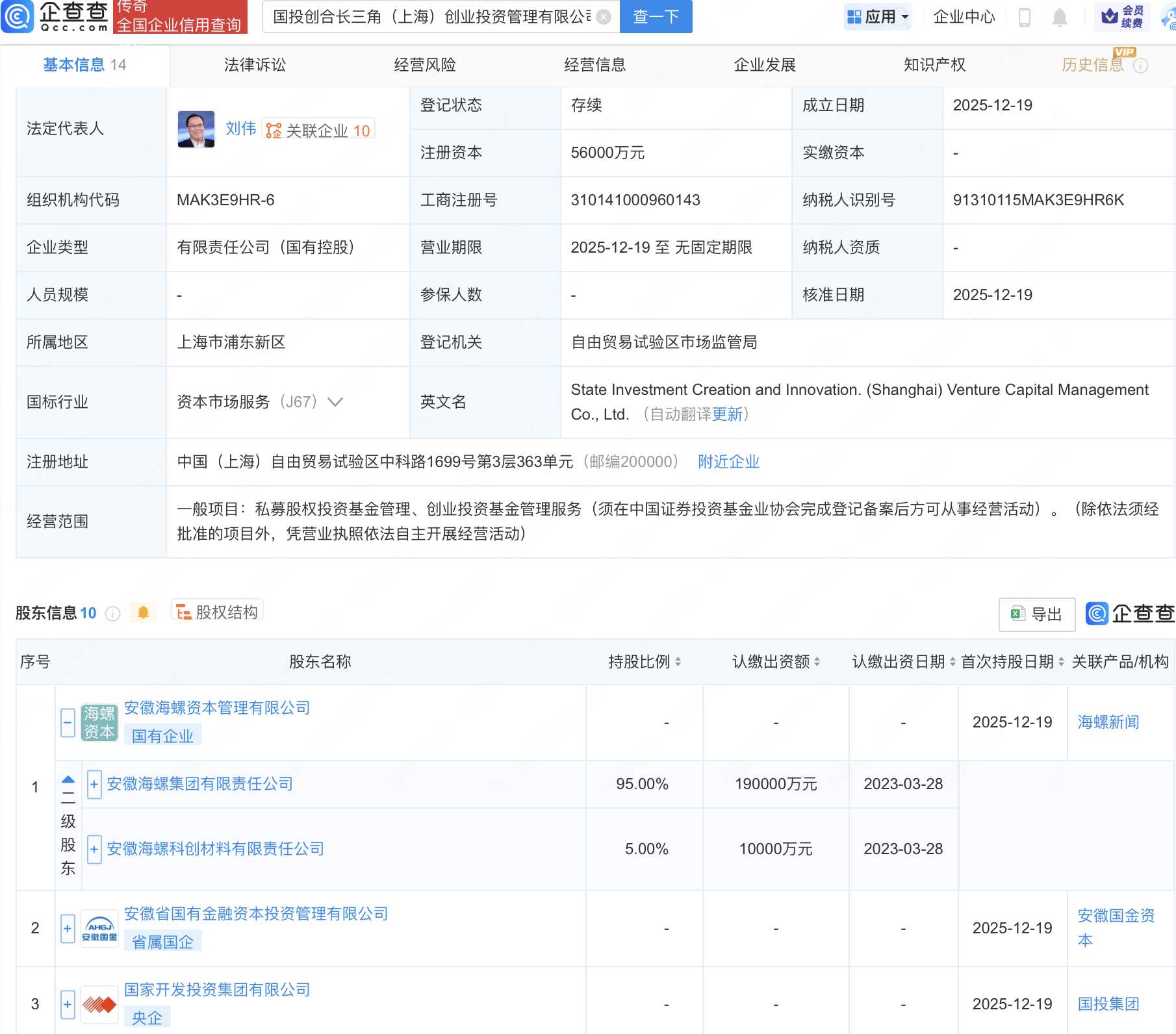 企查查APP显示,近日,国投创合长三角(上海)创业投资管理有限公司成立,注册资本5.6亿元,经营范围包含:私募股权投资基金管理、创业投资基金管理服务。企查查股权穿透显示,该公司由安徽海螺集团有限责任公司旗下安徽海螺资本管理有限公司、国家开发投资集团有限公司等共同持股。