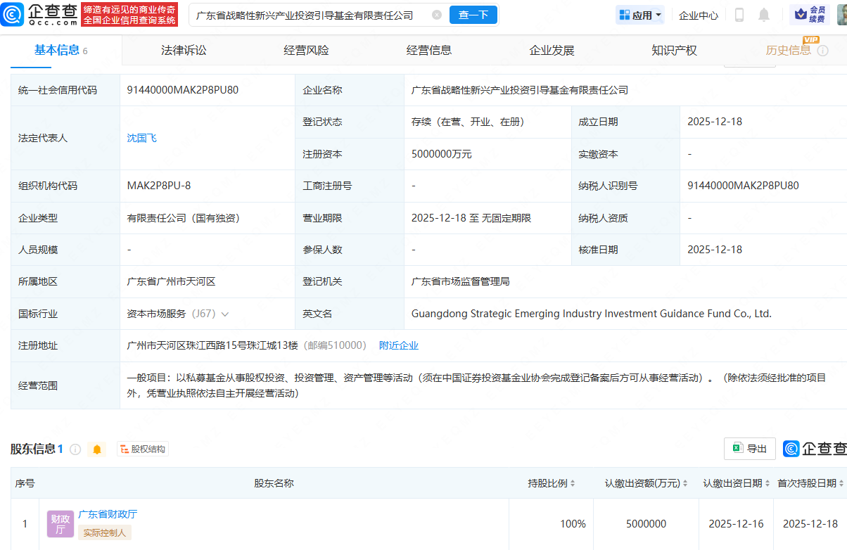 企查查APP显示,近日,广东省战略性新兴产业投资引导基金有限责任公司成立,法定代表人为沈国飞,注册资本为500亿元,经营范围包含:以私募基金从事股权投资、投资管理、资产管理等活动。企查查股权穿透显示,该公司由广东省财政厅全资持股。