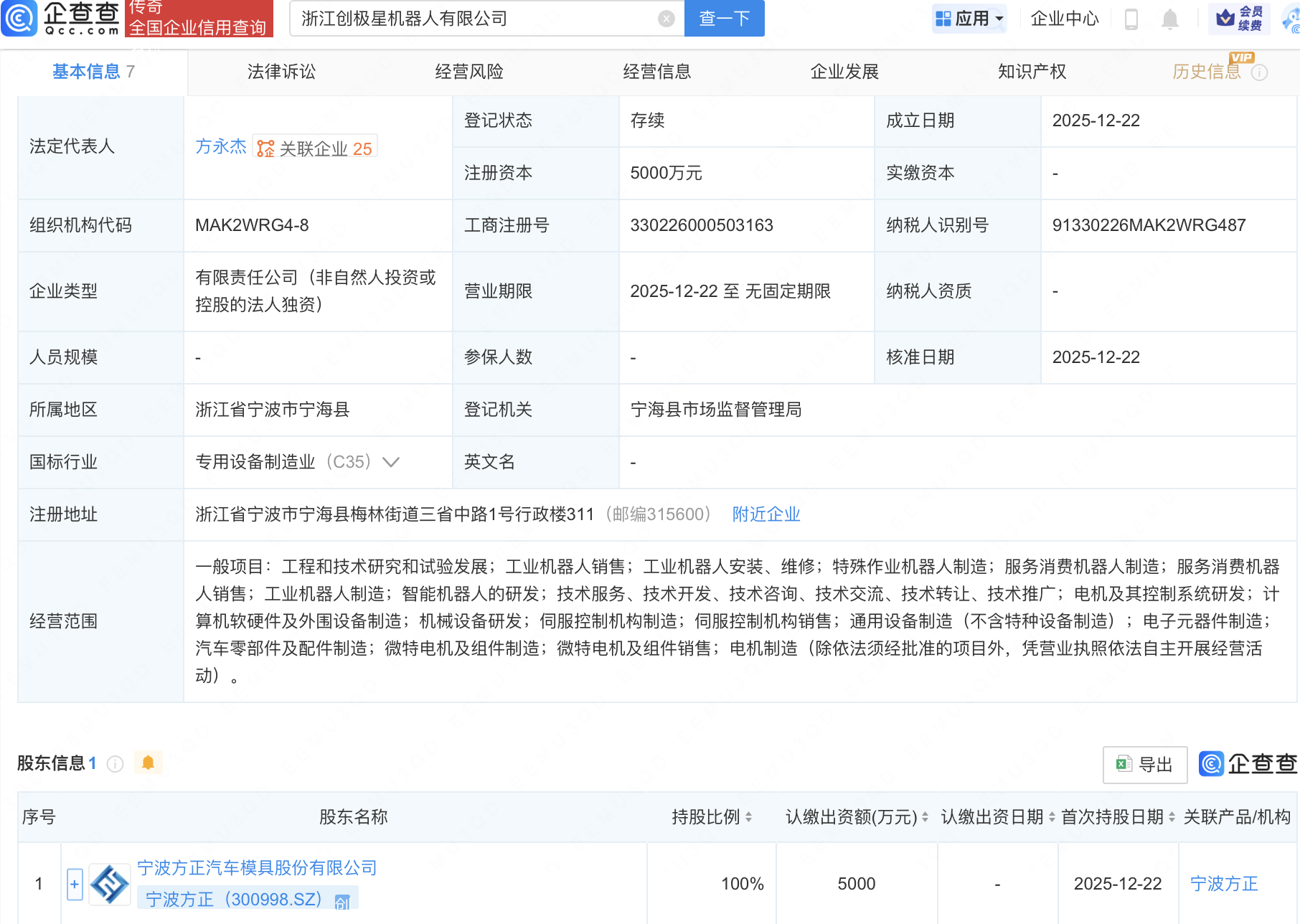 企查查APP显示,近日,浙江创极星机器人有限公司成立,注册资本5000万元,经营范围包含:服务消费机器人制造;服务消费机器人销售;工业机器人制造;智能机器人的研发等。企查查股权穿透显示,该公司由宁波方正(300998)全资持股。