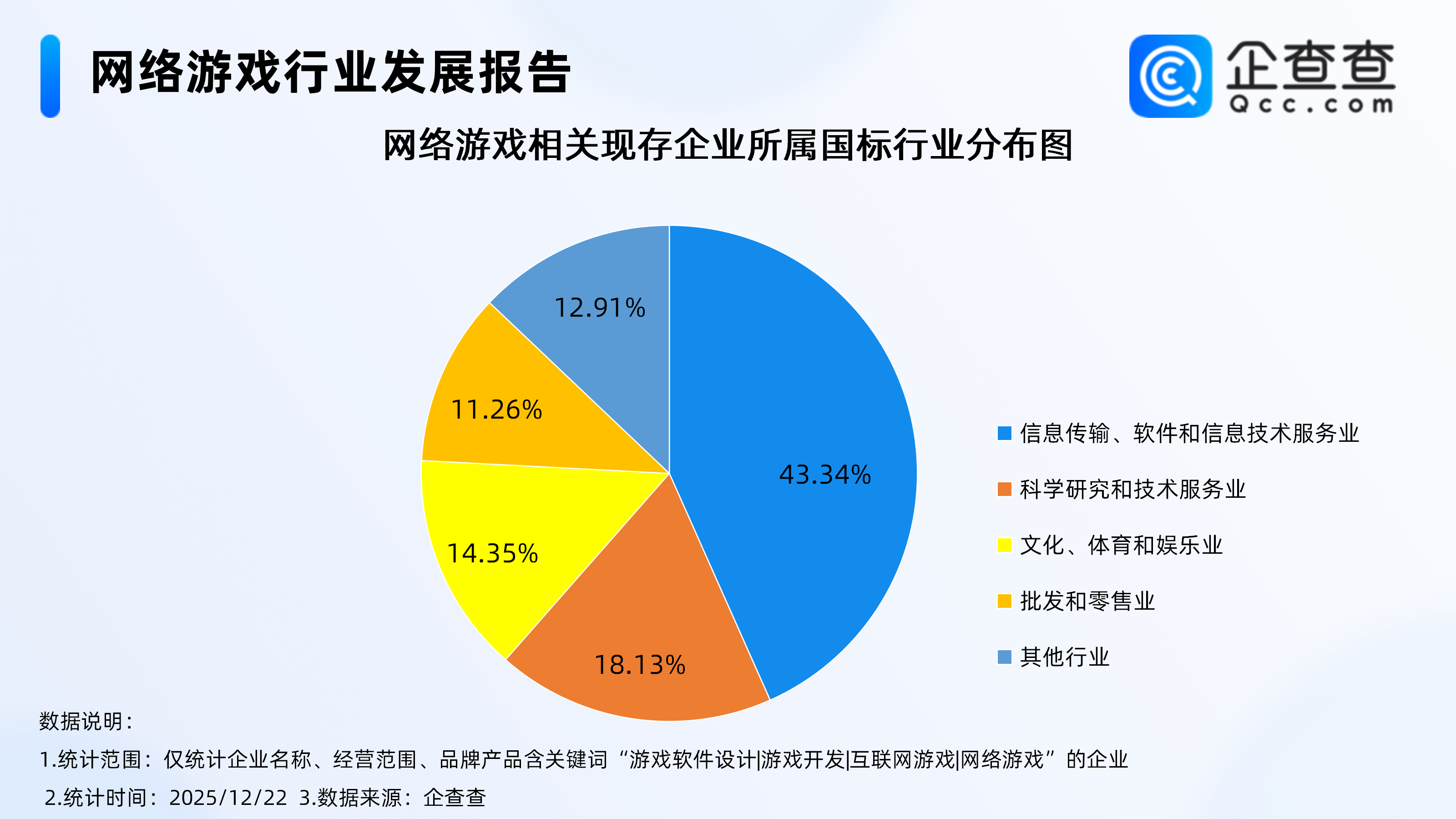 企查查数据显示,国标行业分布上,国内网络游戏相关现存企业中,超4成相关企业归属于信息传输、软件和信息技术服务业,占比达43.34%。其次为归属于科学研究和技术服务业的企业,占比达18.13%。归属于文化、体育和娱乐业的相关企业,占比达14.35%。