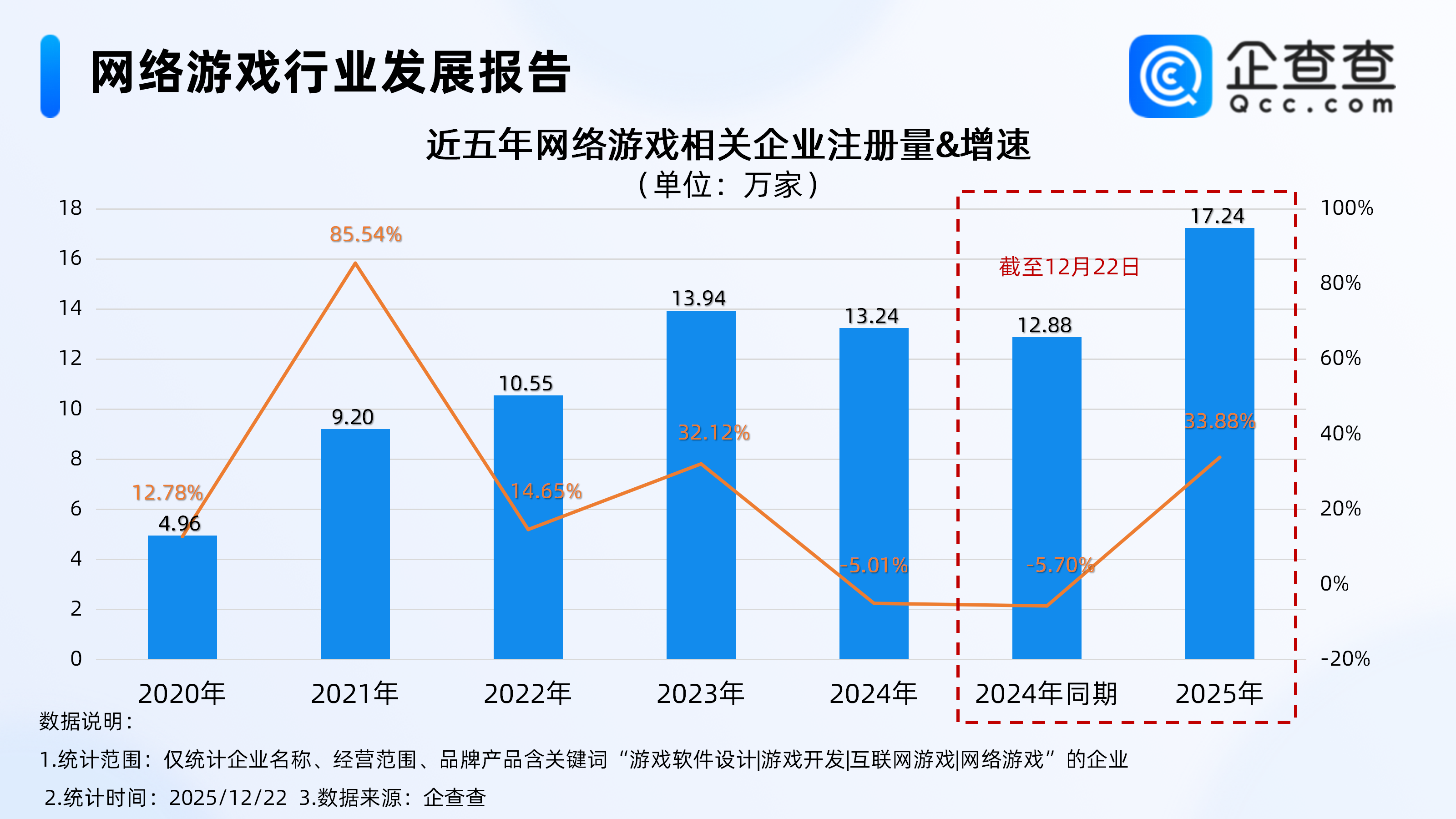 企查查数据显示,截至12月22日,国内现存网络游戏相关企业58.7万家。注册量方面,近五年来相关企业年注册量整体呈上升趋势,2021年注册量达9.2万家,同比增长85.54%,达近五年注册量增速峰值;2024年注册量达13.24万家。截至目前,今年已注册17.24万家,超去年全年注册水平,与2024年同期相比增长33.88%。
