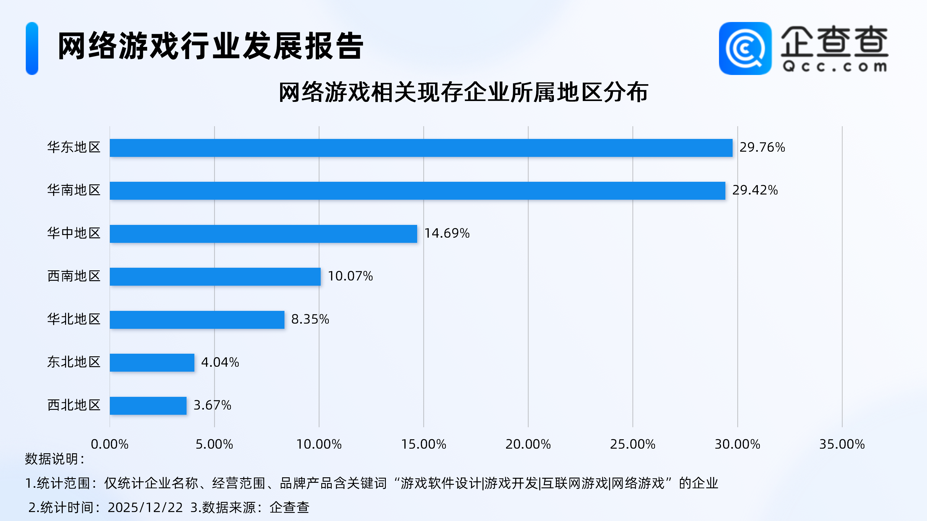 企查查数据显示,截至12月22日,国内现存网络游戏相关企业58.7万家。注册量方面,近五年来相关企业年注册量整体呈上升趋势,2024年注册量达13.24万家,截至目前,今年已注册17.24万家,超去年全年注册水平,与2024年同期相比增长33.88%。存量方面,现存网络游戏相关企业多分布在华东地区、华南地区,分别占比29.76%、29.42%。国标行业分布上,超4成相关企业归属于信息传输、软件和信息技术服务业,占比达43.34%。