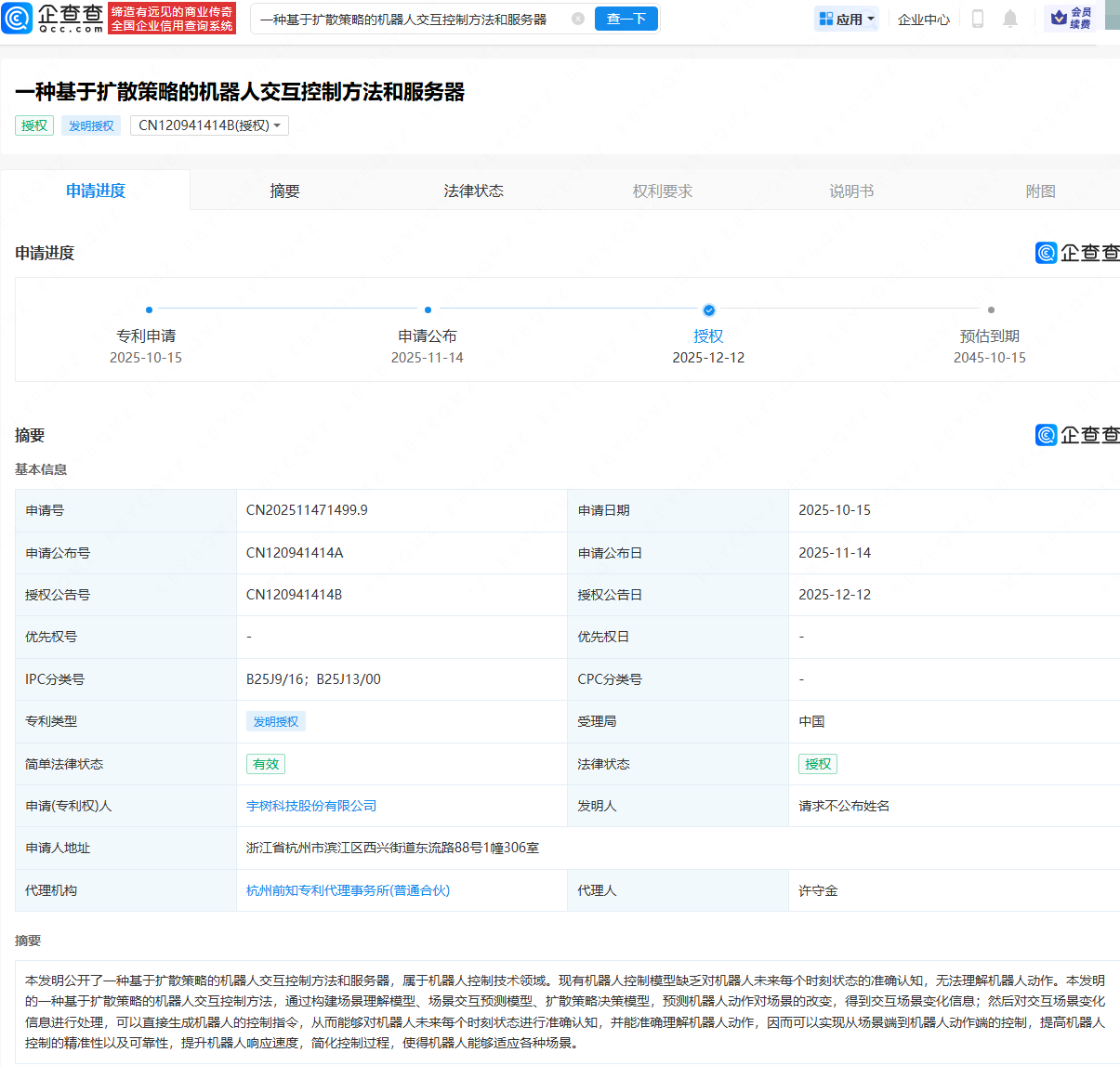 企查查APP显示,近日,宇树科技股份有限公司申请的“一种基于扩散策略的机器人交互控制方法和服务器”专利获授权。