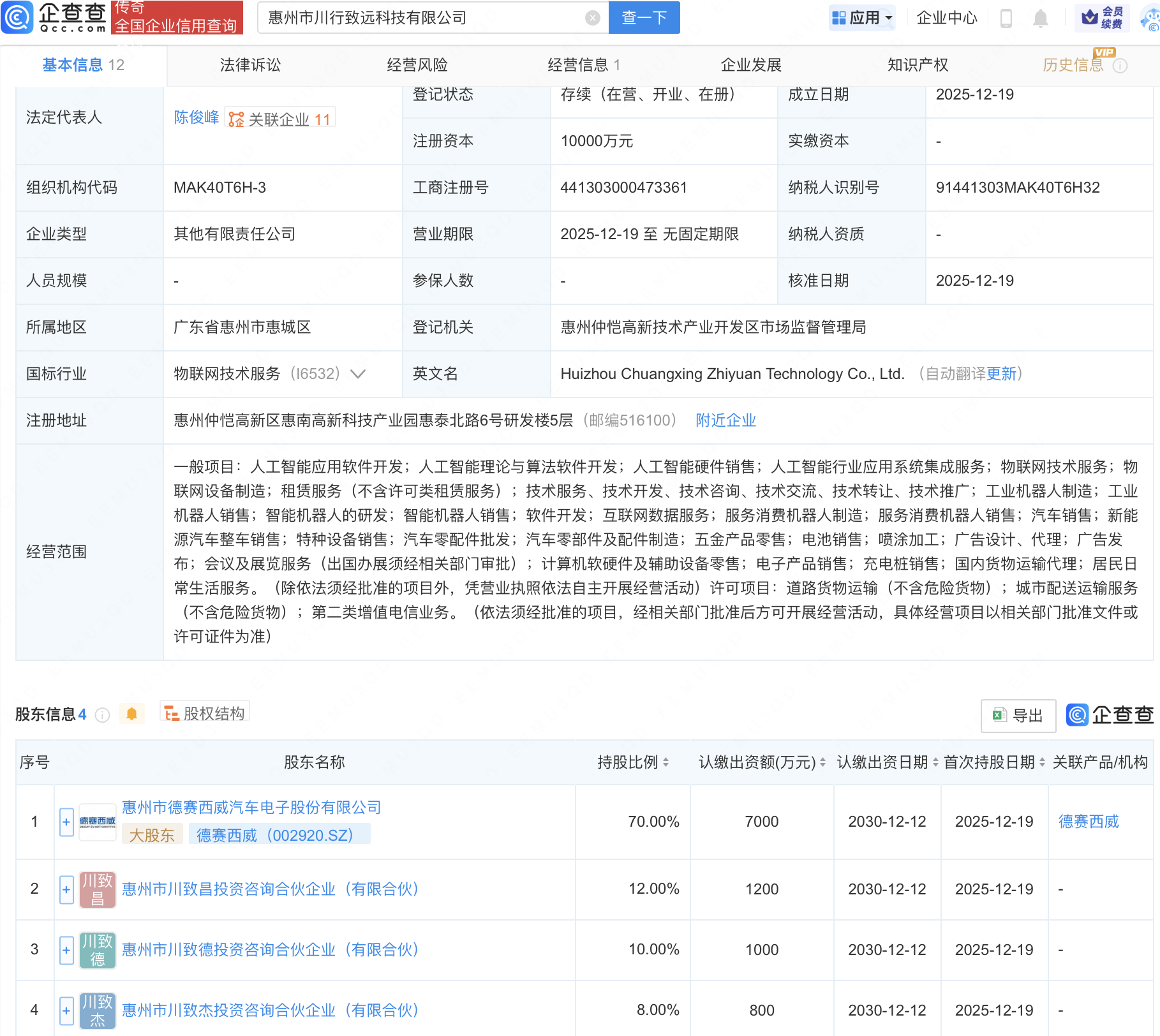 企查查APP显示,近日,惠州市川行致远科技有限公司成立,注册资本1亿元,经营范围包含:人工智能应用软件开发;人工智能理论与算法软件开发;人工智能硬件销售;智能机器人的研发;智能机器人销售等。企查查股权穿透显示,该公司由德赛西威(002920)等共同持股。