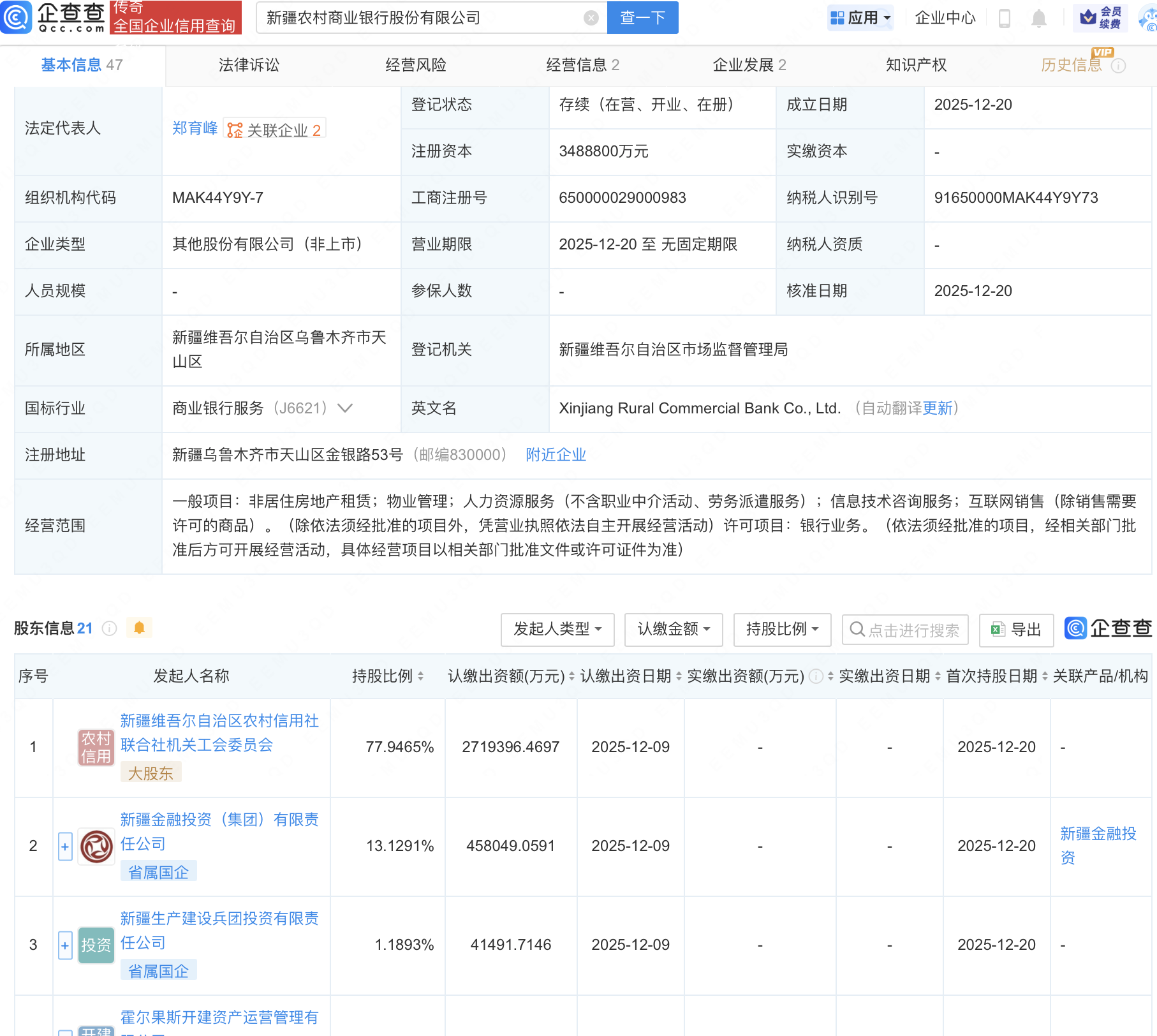 企查查APP显示,近日,新疆农村商业银行股份有限公司成立,注册资本348.88亿元,经营范围包含:非居住房地产租赁;物业管理;银行业务等。企查查股权穿透显示,该公司由新疆维吾尔自治区农村信用社联合社机关工会委员会、新疆金融投资(集团)有限责任公司、新疆生产建设兵团投资有限责任公司等共同持股。