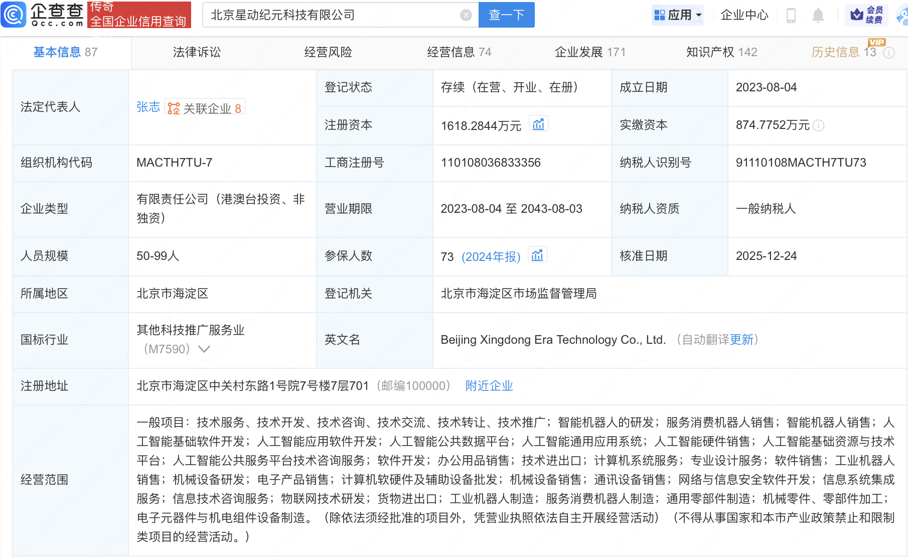 企查查APP显示,近日,北京星动纪元科技有限公司发生工商变更,新增三星风险投资第74技术事业投资有限合伙企业、新电投资有限公司、成都鼎晖盈嘉股权投资基金合伙企业(有限合伙)等为股东,同时注册资本增至1618.28万元。企查查信息显示,该公司成立于2023年,法定代表人为张志,经营范围包含:智能机器人的研发;服务消费机器人销售;人工智能应用软件开发;人工智能公共数据平台;人工智能通用应用系统等。