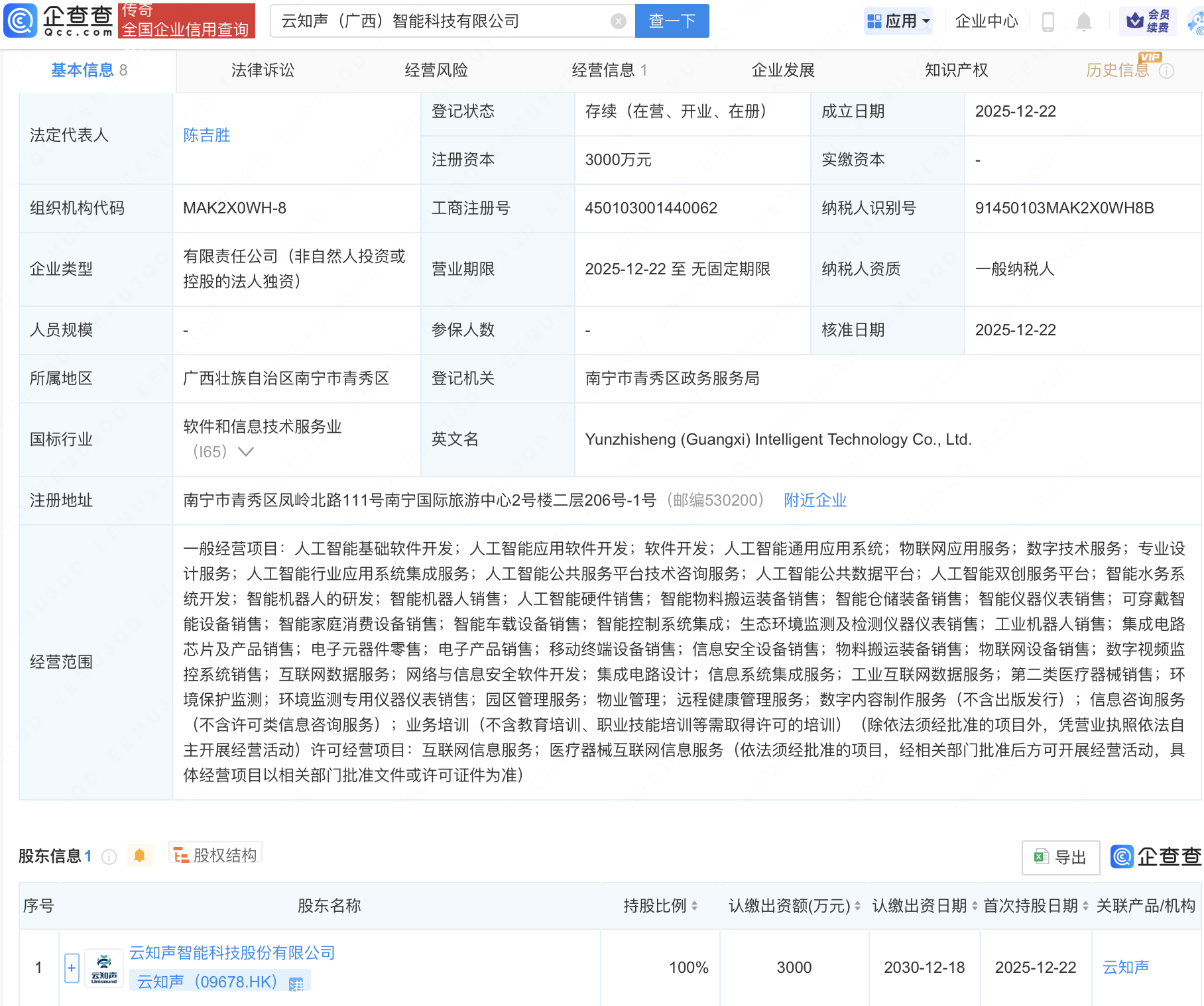 企查查APP显示,近日,云知声(广西)智能科技有限公司成立,经营范围包含:人工智能基础软件开发;人工智能应用软件开发;智能机器人的研发;集成电路芯片及产品销售等。企查查股权穿透显示,该公司由云知声(09678.HK)全资持股。