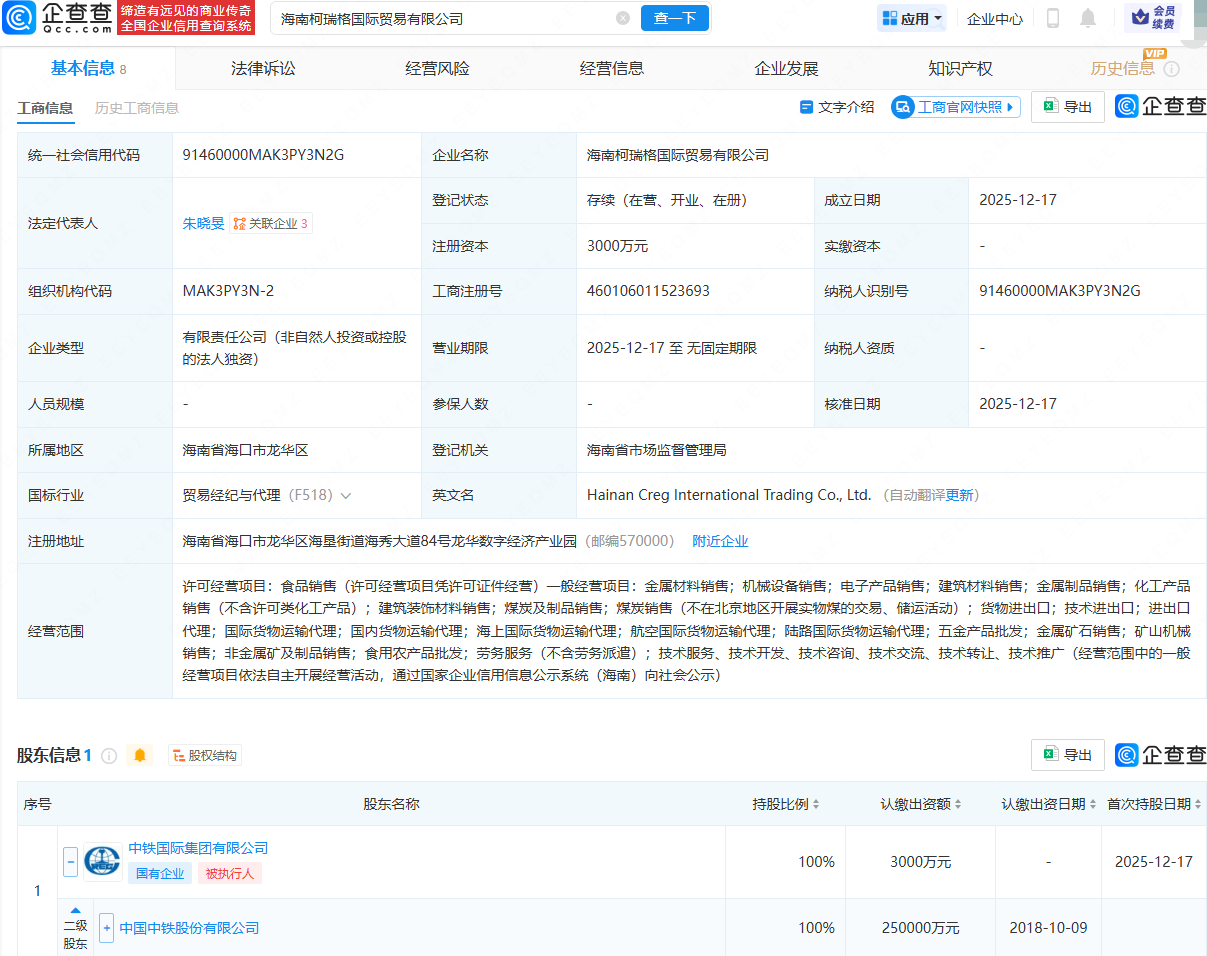 企查查APP显示,近日,海南柯瑞格国际贸易有限公司成立,法定代表人为朱晓旻,注册资本为3000万元,经营范围包含:金属材料销售;机械设备销售;电子产品销售;建筑材料销售;金属制品销售;国际货物运输代理等。企查查股权穿透显示,该公司由中国中铁(601390)间接全资持股。