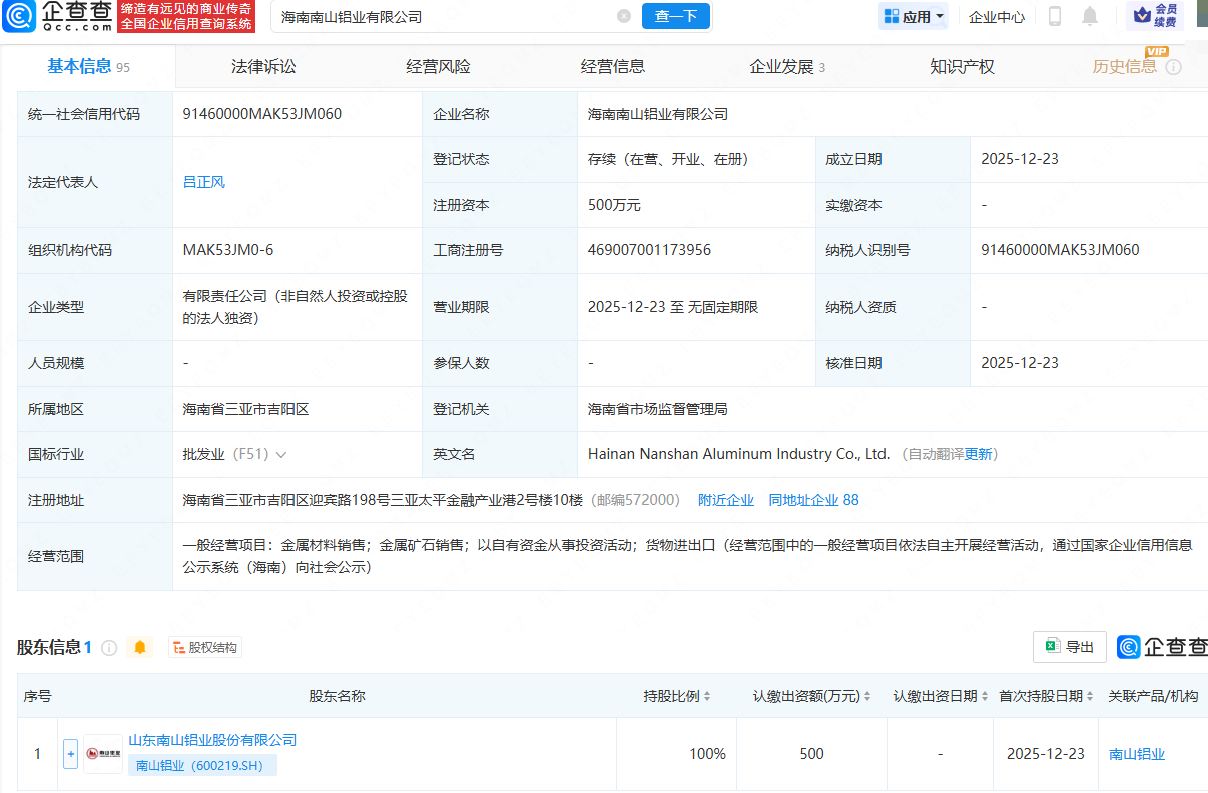 企查查APP显示,近日,海南南山铝业有限公司成立,法定代表人为吕正风,经营范围包含:金属材料销售;金属矿石销售;以自有资金从事投资活动;货物进出口。企查查股权穿透显示,该公司由南山铝业(600219)全资持股。