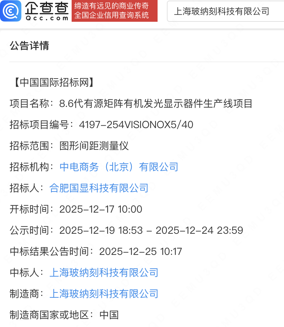企查查APP显示,近日,上海玻纳刻科技有限公司中标8.6代有源矩阵有机发光显示器件生产线项目,招标人为合肥国显科技有限公司。企查查信息显示,上海玻纳刻科技有限公司成立于2025年7月,经营范围包含:半导体器件专用设备制造;电子专用设备制造;智能基础制造装备制造;光学仪器制造等,由上海芯上微装科技股份有限公司全资持股。公开信息显示,芯上微装是一家专注于高端半导体装备研发、生产和服务的科技企业,其核心业务包括光刻机的设计与制造。