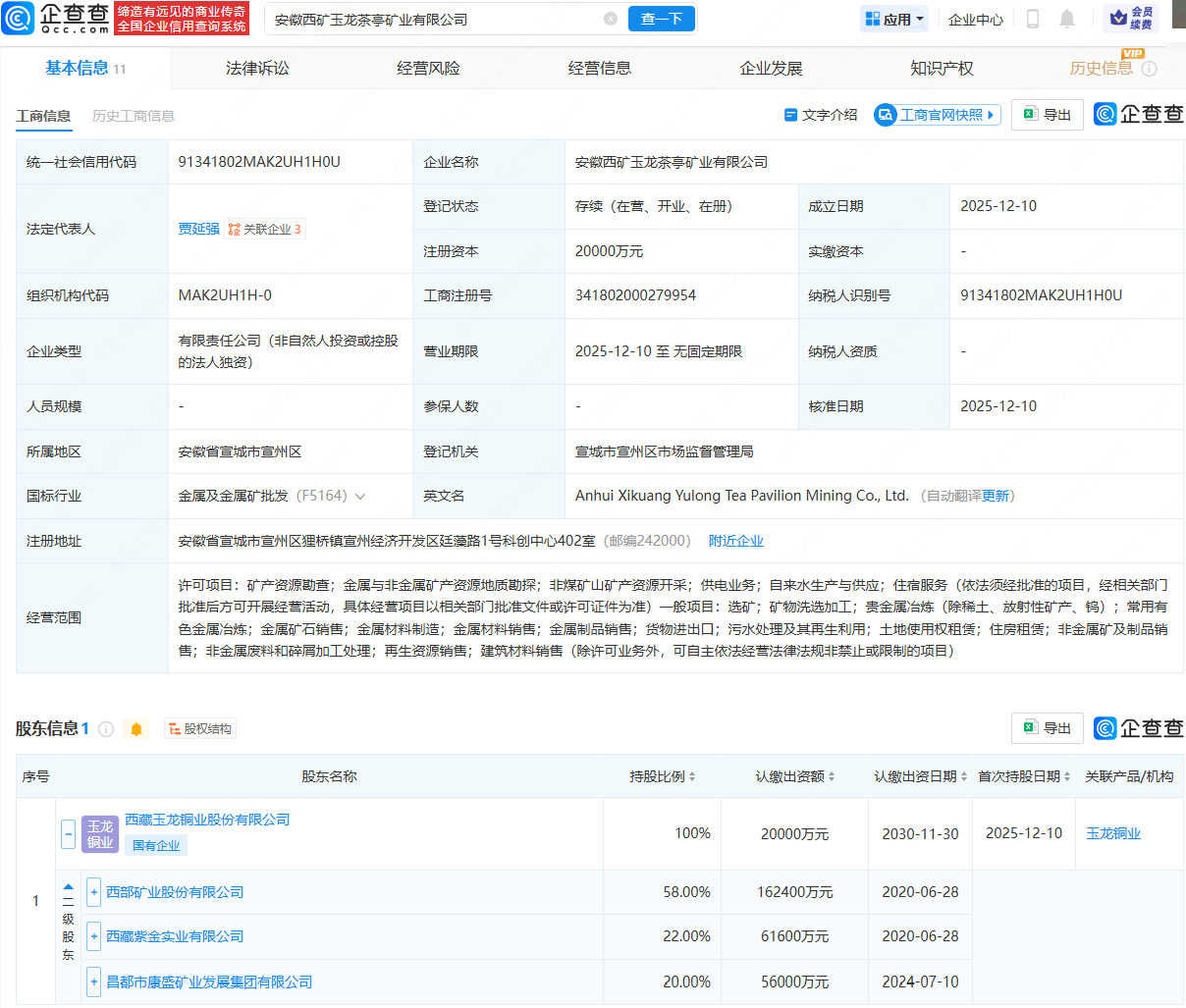 企查查APP显示,近日,安徽西矿玉龙茶亭矿业有限公司成立,法定代表人为贾延强,注册资本为2亿元,经营范围包含:矿产资源勘查;金属与非金属矿产资源地质勘探;非煤矿山矿产资源开采;供电业务;金属材料制造等。企查查股权穿透显示,该公司由西部矿业(601168)旗下西藏玉龙铜业股份有限公司全资持股。