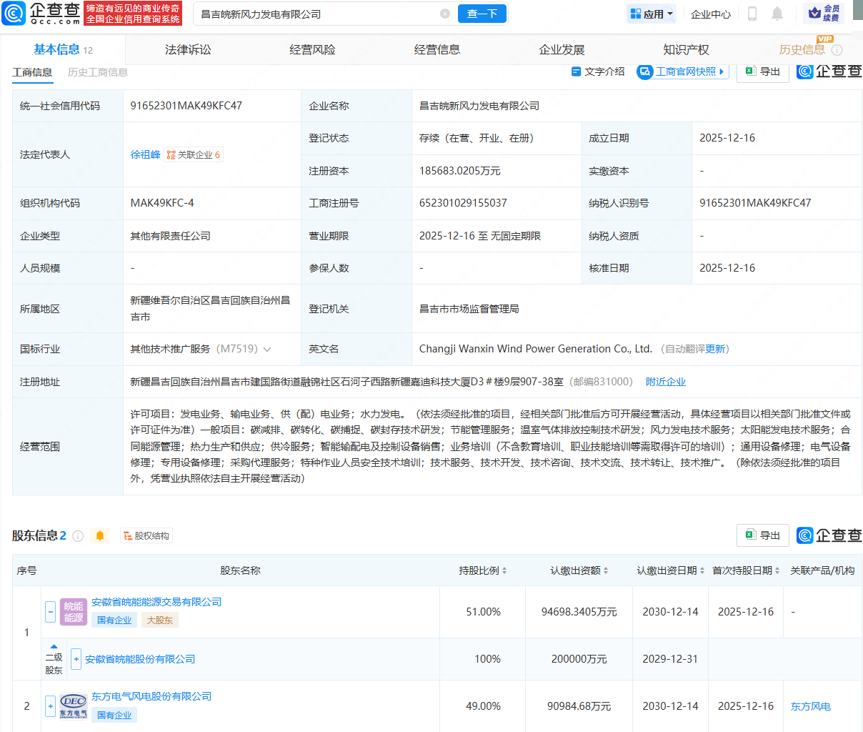 企查查APP显示,近日,昌吉皖新风力发电有限公司成立,法定代表人为徐祖峰,注册资本约为18.57亿元,经营范围包含:发电业务、输电业务、供(配)电业务;水力发电;节能管理服务;风力发电技术服务;太阳能发电技术服务等。企查查股权穿透显示,该公司由皖能电力(000543)全资子公司安徽省皖能能源交易有限公司、东方电气风电股份有限公司共同持股。