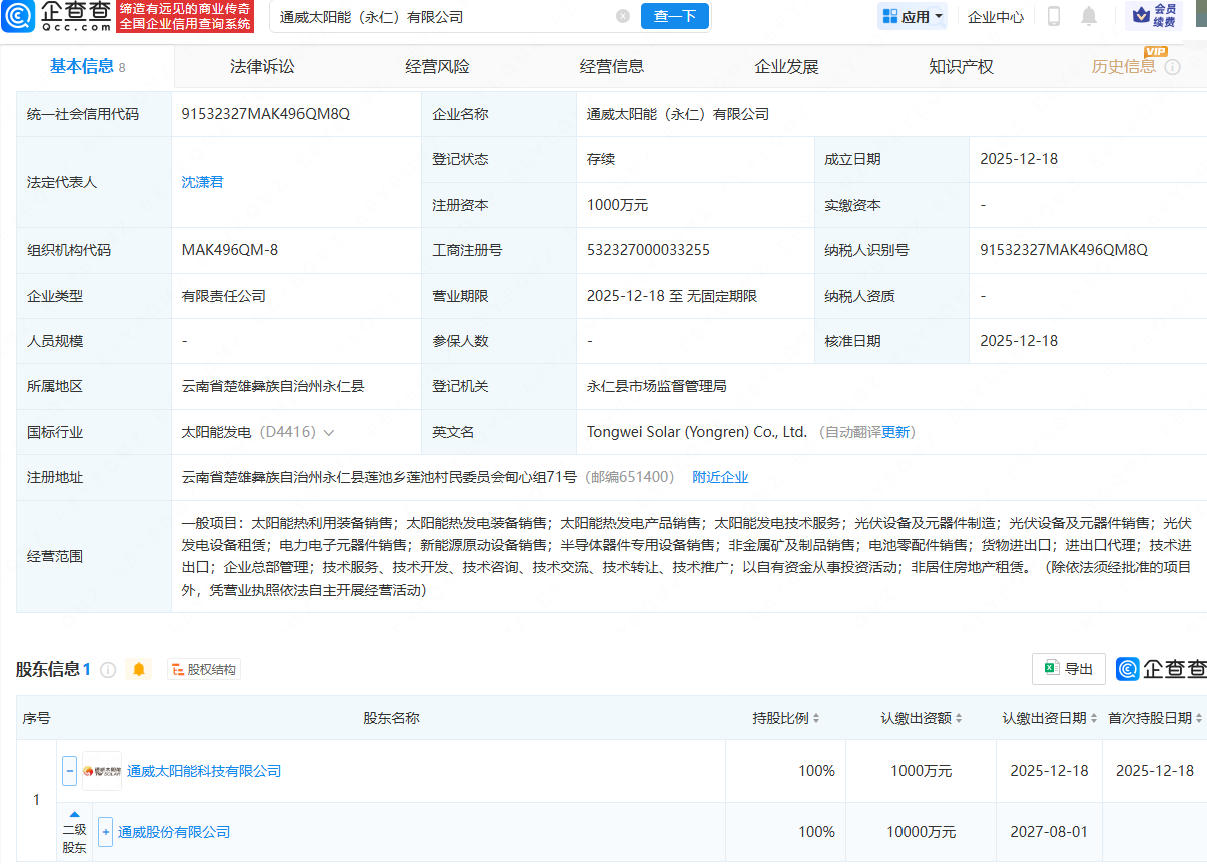 企查查APP显示,近日,通威太阳能(永仁)有限公司成立,法定代表人为沈潇君,注册资本为1000万元,经营范围包含:太阳能热利用装备销售;太阳能热发电装备销售;太阳能热发电产品销售;太阳能发电技术服务等。企查查股权穿透显示,该公司由通威股份(600438)间接全资持股。