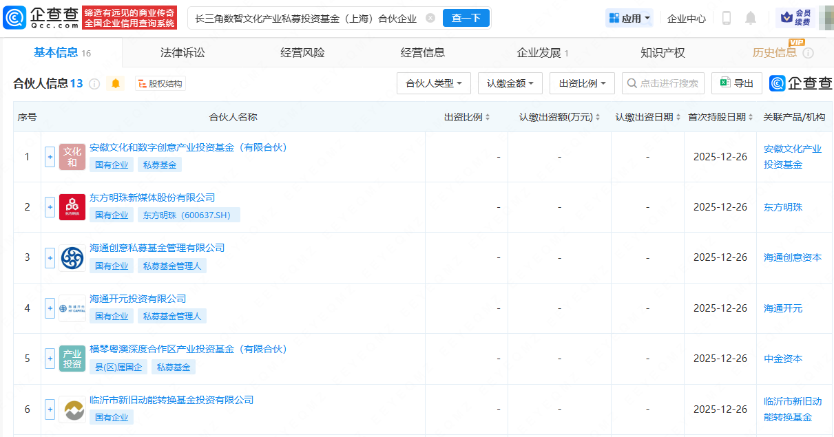 企查查APP显示,近日,长三角数智文化产业私募投资基金(上海)合伙企业(有限合伙)成立,出资额30.03亿元,经营范围包含:以私募基金从事股权投资、投资管理、资产管理等活动。企查查股权穿透显示,该合伙企业由安徽文化和数字创意产业投资基金(有限合伙)、东方明珠(600637)等共同持股。