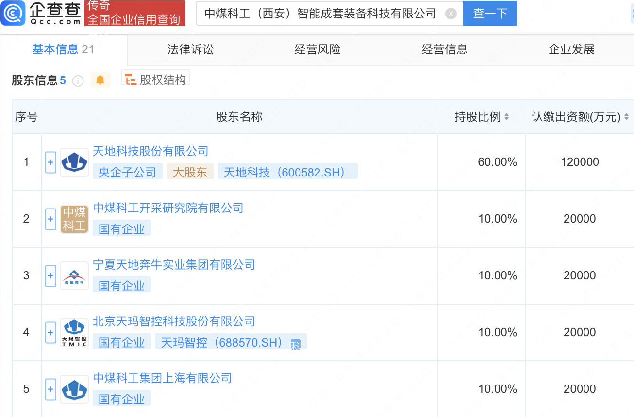企查查APP显示,近日,中煤科工(西安)智能成套装备科技有限公司成立,注册资本20亿元,经营范围包含:人工智能行业应用系统集成服务;人工智能理论与算法软件开发;数字视频监控系统制造等。企查查股权穿透显示,该公司由天地科技(600582)、天玛智控(688570)等共同持股。
