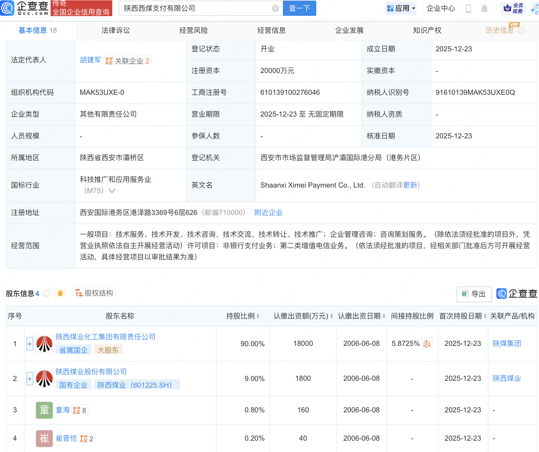 企查查APP显示,近日,陕西西煤支付有限公司成立,注册资本2亿元,经营范围包含:非银行支付业务;第二类增值电信业务等。企查查股权穿透显示,该公司由陕西煤业(601225)等共同持股。