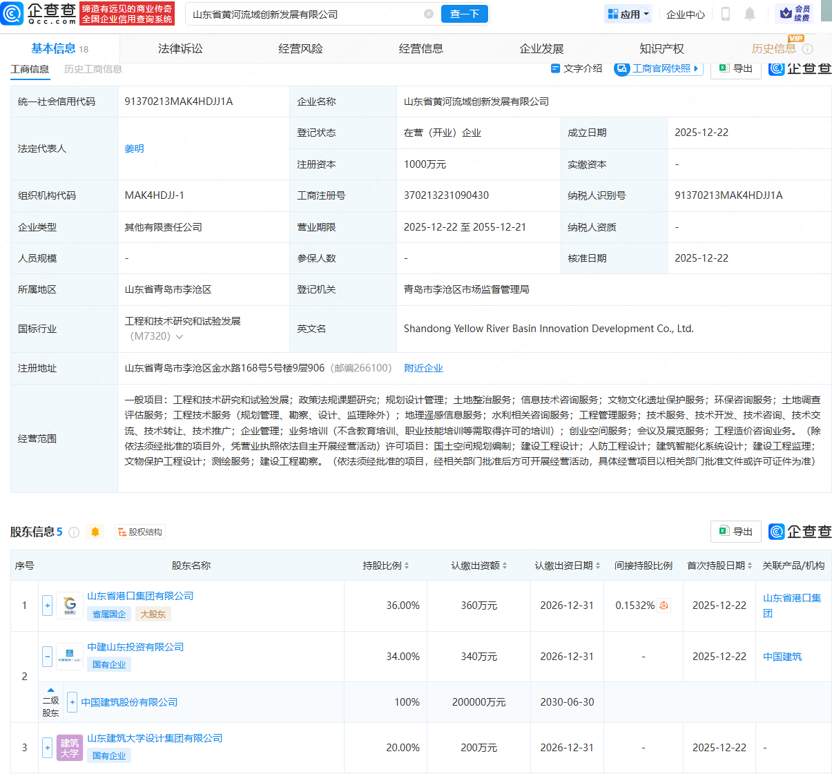 企查查APP显示,近日,山东省黄河流域创新发展有限公司成立,法定代表人为姜明,注册资本为1000万元,经营范围包含:土地整治服务;信息技术咨询服务;文物文化遗址保护服务;环保咨询服务;土地调查评估服务等。企查查股权穿透显示,该公司由山东省港口集团有限公司、中国建筑(601668)全资子公司中建山东投资有限公司等共同持股。
