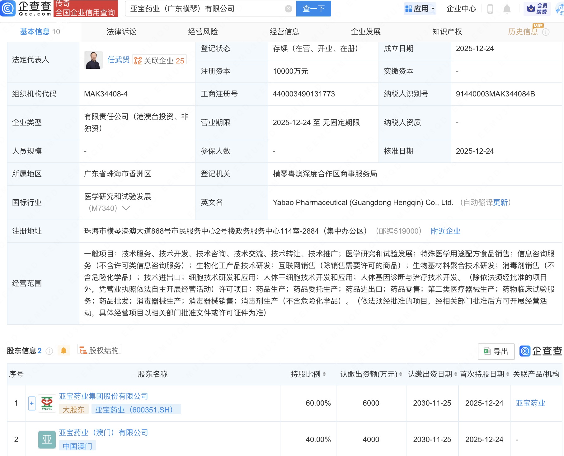 企查查APP显示,近日,亚宝药业(广东横琴)有限公司成立,法定代表人为任武贤,注册资本1亿人民币,经营范围包括医学研究和试验发展、生物化工产品技术研发、生物基材料聚合技术研发等。企查查股权穿透显示,该公司由亚宝药业(600351)、亚宝药业(澳门)有限公司共同持股。