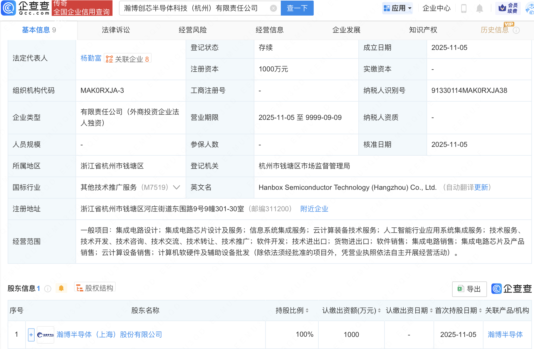 企查查APP显示,瀚博创芯半导体科技(杭州)有限责任公司成立,经营范围包含:集成电路设计;集成电路芯片设计及服务;人工智能行业应用系统集成服务;集成电路销售等。企查查股权穿透显示,该公司由瀚博半导体(上海)股份有限公司全资持股。