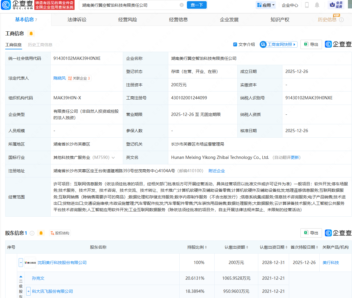企查查APP显示,近日,湖南美行翼空智泊科技有限责任公司成立,法定代表人为隋晓风,经营范围包含:地理遥感信息服务;汽车零配件批发;汽车零配件零售;云计算装备技术服务;人工智能应用软件开发等。企查查股权穿透显示,该公司由沈阳美行科技股份有限公司全资持股,后者由孙克文、科大讯飞(002230)等共同持股。