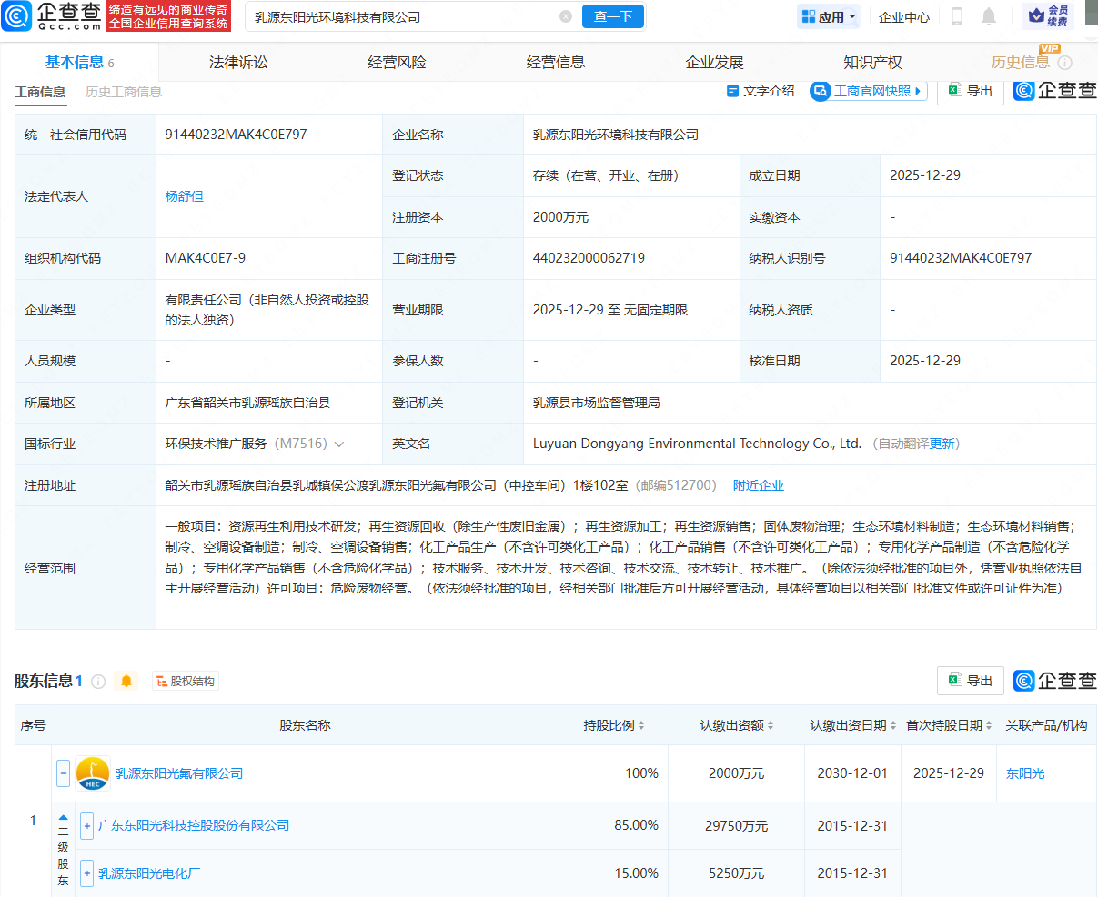 企查查APP显示,近日,乳源东阳光环境科技有限公司成立,法定代表人为杨舒但,注册资本为2000万元,经营范围包含:资源再生利用技术研发;再生资源加工;固体废物治理;生态环境材料制造;制冷、空调设备制造等。企查查股权穿透显示,该公司由东阳光(600673)旗下乳源东阳光氟有限公司全资持股。