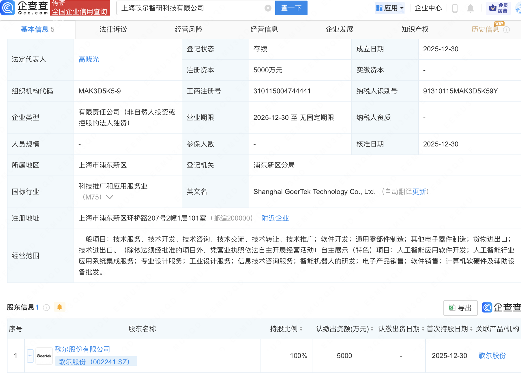 企查查APP显示,近日,上海歌尔智研科技有限公司成立,注册资本5000万元,经营范围包含:软件开发;通用零部件制造;人工智能应用软件开发;人工智能行业应用系统集成服务等。企查查股权穿透显示,该公司由歌尔股份(002241)全资持股。