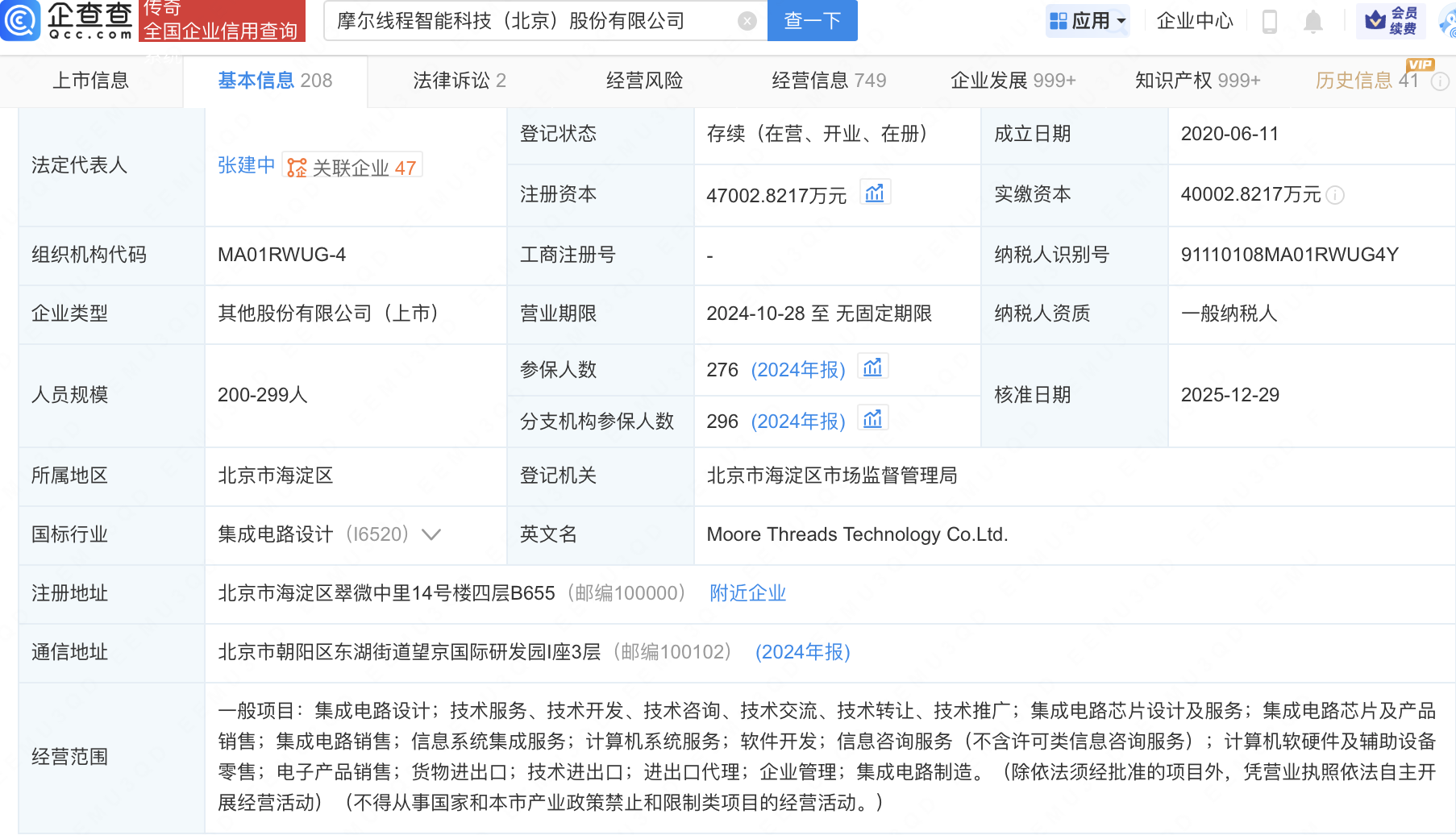 企查查APP显示,近日,摩尔线程(688795)发生工商变更,注册资本由4亿元增至4.7亿元。企查查信息显示,该公司成立于2020年,经营范围包含:集成电路芯片设计及服务;集成电路芯片及产品销售;集成电路销售;信息系统集成服务等。