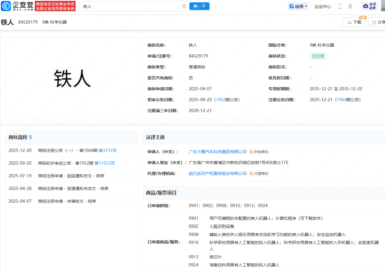 企查查APP显示,近日,广东小鹏汽车科技集团有限公司成功注册一枚“铁人”商标,国际分类为9类 科学仪器,已申请商品/服务包括:科学研究用具有人工智能的拟人机器人;科学研究用具有人工智能的人形机器人;实验室机器人等。此前,小鹏发布IRON人形机器人,引发热议。