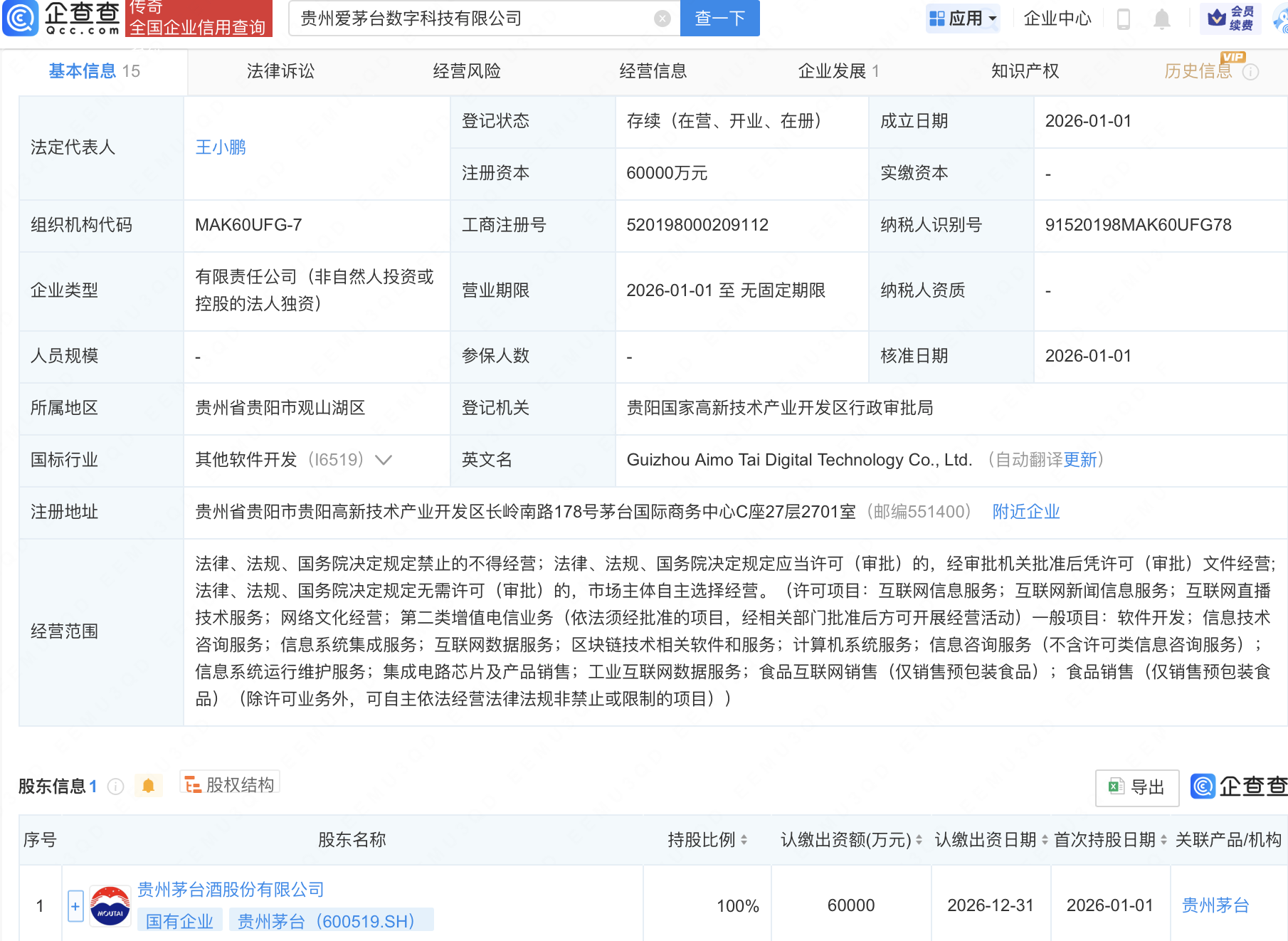 企查查APP显示,近日,贵州爱茅台数字科技有限公司成立,注册资本6亿元,经营范围包含:互联网直播技术服务;区块链技术相关软件和服务;集成电路芯片及产品销售;工业互联网数据服务等。企查查股权穿透显示,该公司由贵州茅台(600519)全资持股。