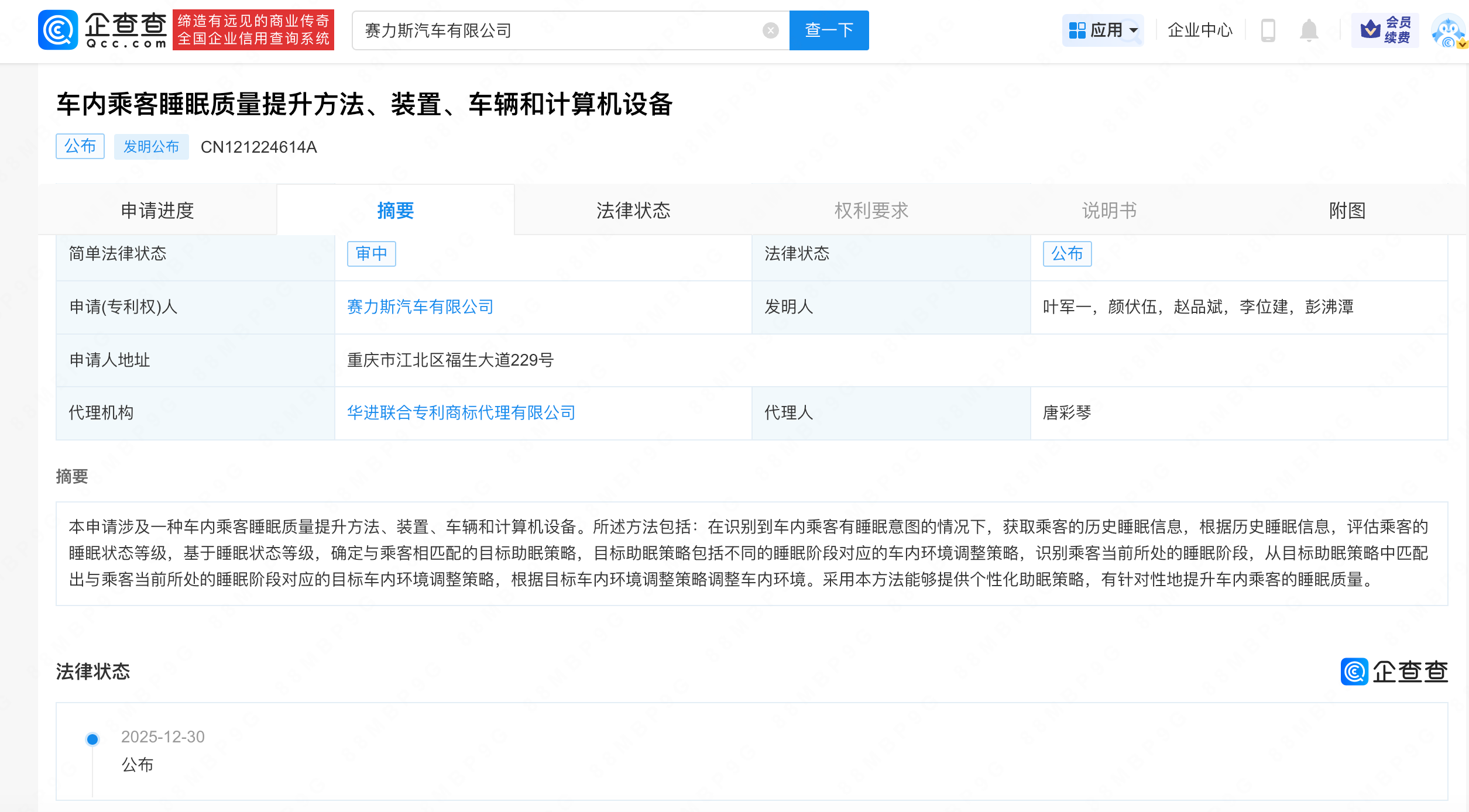 企查查APP显示,近日,赛力斯汽车有限公司申请的“车内乘客睡眠质量提升方法、装置、车辆和计算机设备”专利公布。