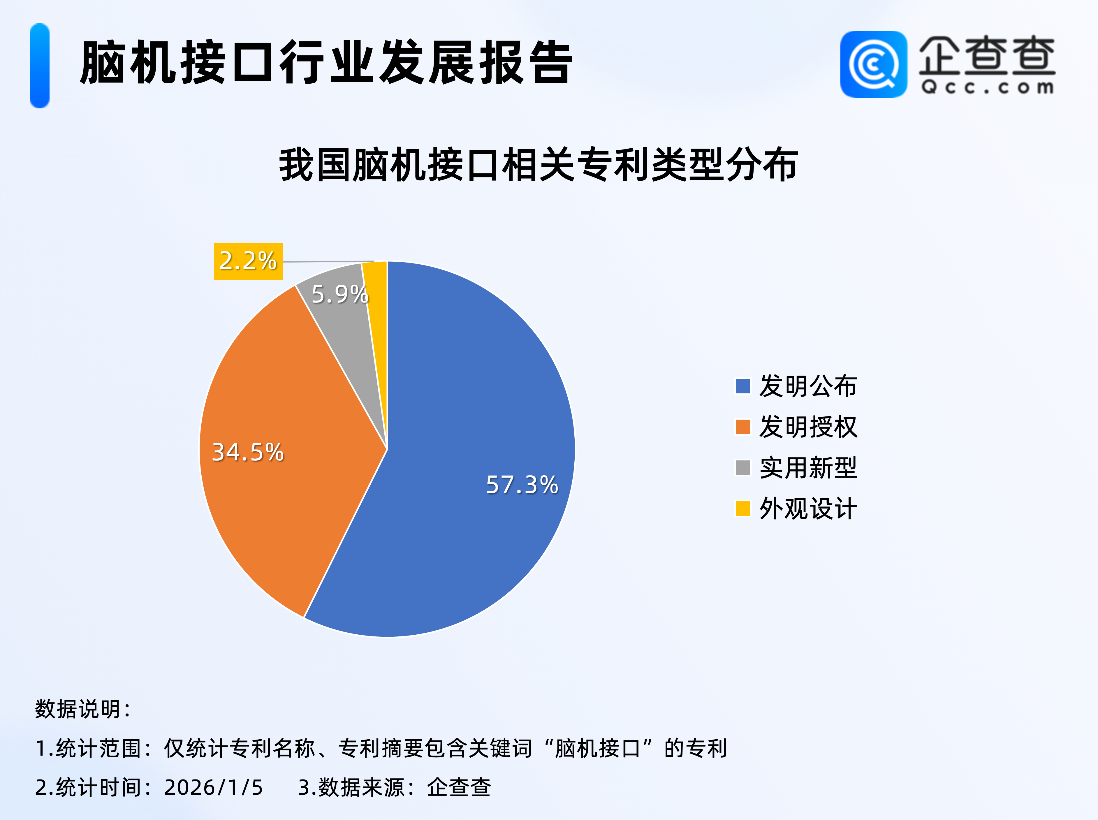 企查查数据显示,截至2026年年初,我国现有2041项脑机接口相关专利,专利类型以发明专利(发明公布、发明授权)为主,合计占比超9成,其中发明公布占比57.3%,其次是发明授权,占比34.5%,外观设计类占比最少,为2.2%。