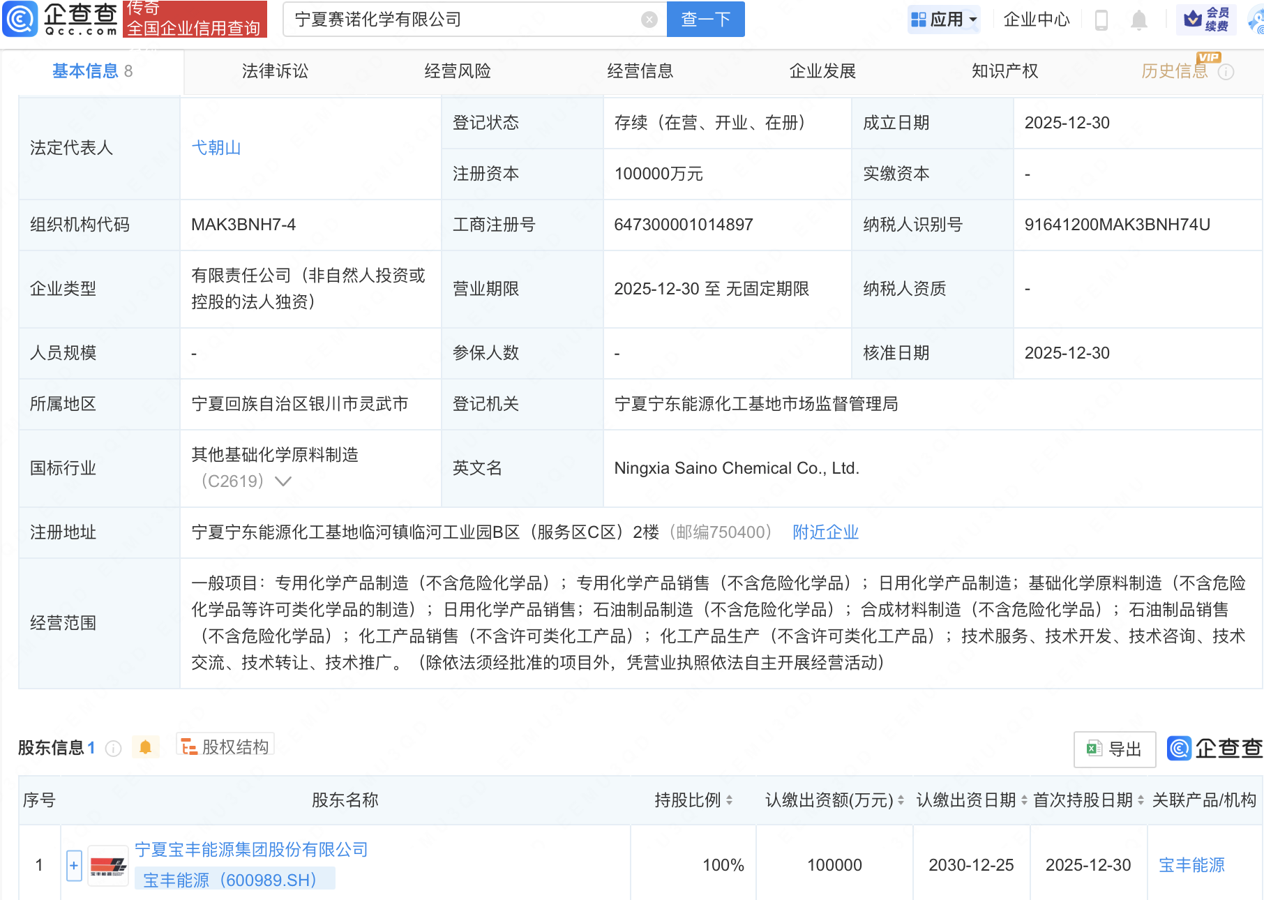 企查查APP显示,近日,宁夏赛诺化学有限公司成立,注册资本10亿元,经营范围包含:专用化学产品制造(不含危险化学品);专用化学产品销售(不含危险化学品);日用化学产品制造等。企查查股权穿透显示,该公司由宝丰能源(600989)全资持股。